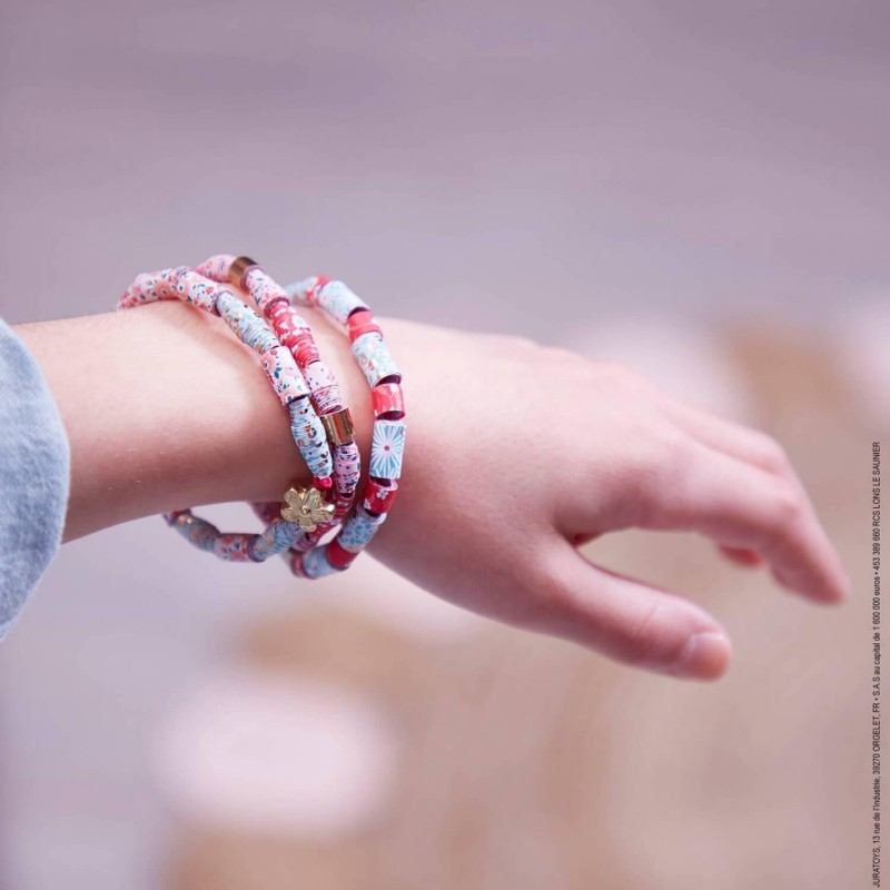 Créez vos propres bijoux en papier à fleurs. Vous pouvez créer deux colliers ou quatre bracelets avec ce kit créatif. Vous pouvez créer vos propres perles en papier avec cette technique. Chaque étape est expliquée dans un guide étape par étape. Chaque feuille de papier est imprimée avec de beaux motifs et des lignes de découpe sur le devant, ainsi que divers symboles au dos. Chaque symbole représente une pièce ou un composant de bijoux qui doit être fabriqué. Enroulez les bandes de papier autour du bâton pour former les perles. Une fois que toutes les perles ont été disposées dans un collier ou un bracelet, vous pouvez simplement suivre les instructions pour les assembler. Cette activité vous aidera à développer votre motricité fine et votre concentration. Il amusera vos enfants pendant une heure (par bijou).