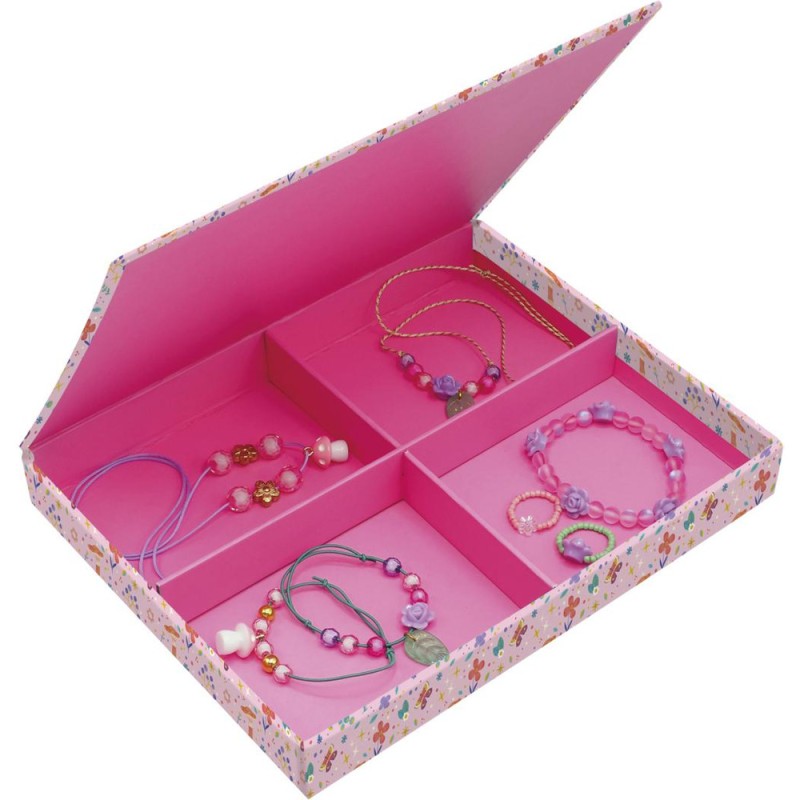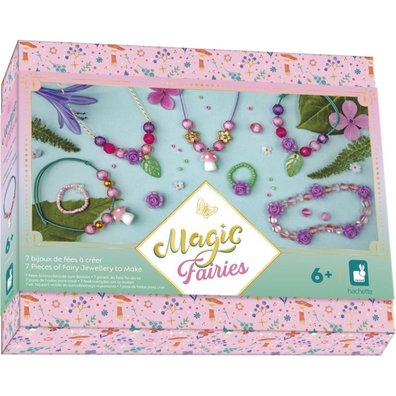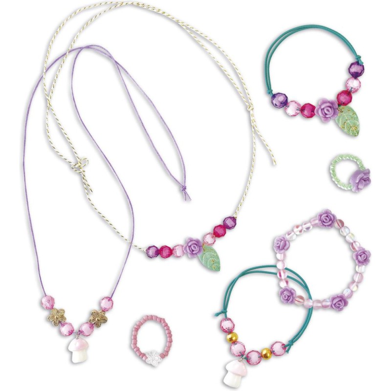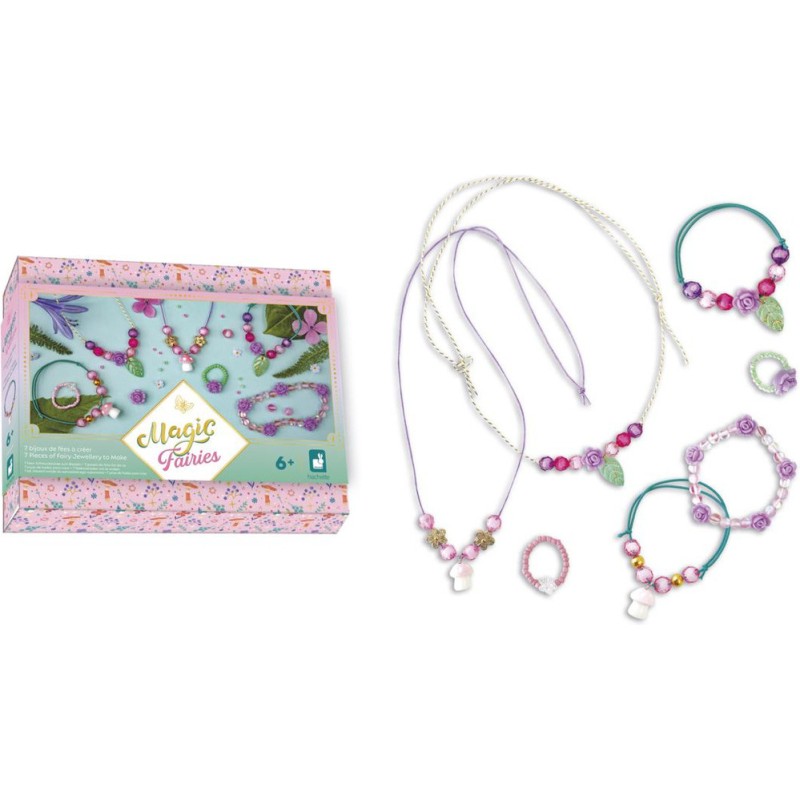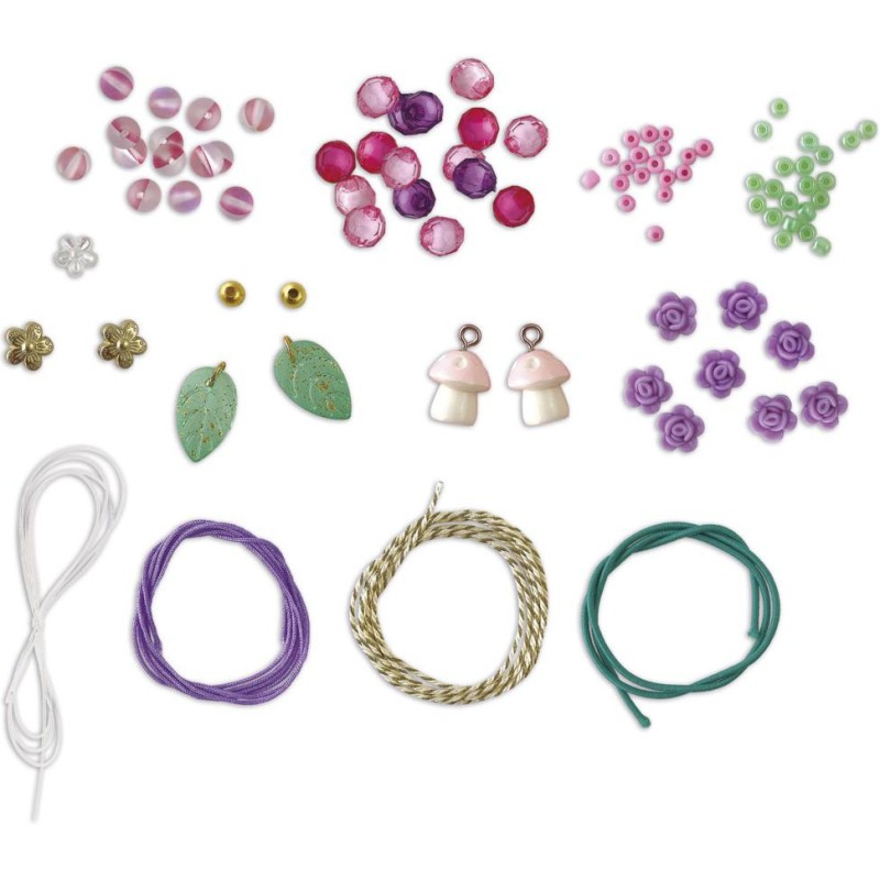 De vrais bijoux de fées ! Avec ce kit créatif, les enfants à partir de 6 ans réalisent 7 bijoux magiques. Un atelier création de bijoux, c’est idéal pour développer sa créativité et sa dextérité, mais aussi pour affirmer son style ! Porter ses propres créations ou les offrir, ça renforce la confiance en soi. Pour mener à bien leur atelier bijoux, les enfants disposent de tout le nécessaire dans le coffret : 2 breloques champignons, 8 perles en forme de rose, 1 perle fleur transparente, 1 perle fleur dorée, 2 pendentifs feuilles, 50 perles de rocaille, 2 perles dorées, 20 perles roses transparentes, 20 perles rondes, du fil élastique vert, du fil élastique transparent, du fil violet, du fil tressé, et 1 livret avec modèles et instructions. Étape par étape, les enfants créent ainsi 2 colliers, 3 bracelets et 2 bagues. En voilà une jolie parure ! Avec ses bijoux de fées, votre enfant complète son look du jour ou encore ses déguisements, pour toujours arborer une touche de magie, le tout grâce à un chouette loisir créatif. Les couleurs tendres et les breloques sur le thème de la nature sont du plus bel effet ! Le gros plus : la boîte que l’on conserve pour ranger ses bijoux grâce aux croisillons fournis pour créer 4 compartiments à l’intérieur. Découvrez l'univers de la collection "Magic Fairies", des kits de loisirs créatifs et d’ateliers déco pour enfant sur le thème des fées, dans un style doux et floral. Pour des après-midis créatifs qui font rêver !