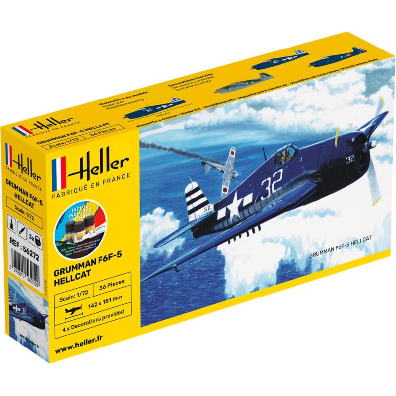 Kit de démarrage - F6F Hellcat - Heller - Starter Kit (Kit de démarrage tout inclus : colle, pinceau, peintures) - Heller 56272Au cours de l’été 1943 apparaît le F6F-5, version améliorée du F6F-3. Il comporte un pare-brise et un capot moteur entièrement redessinés et peut porter jusqu’à 907 kg de bombes sous le fuselage et six roquettes d’attaque au sol sous les ailes, ce qui en fait un avion d’attaque particulièrement redoutable.