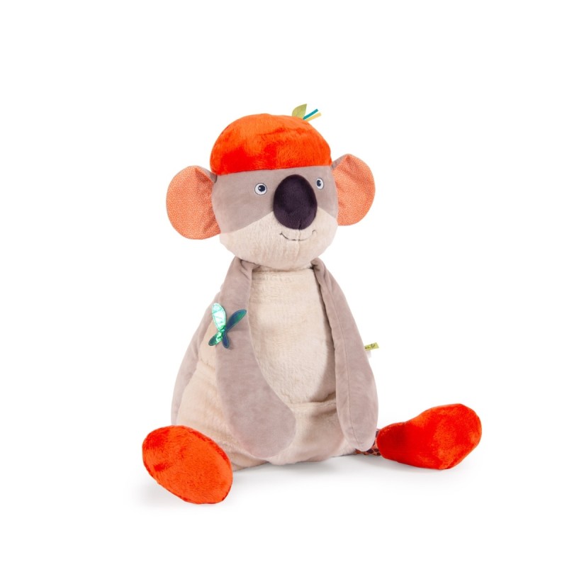 Jeu de textures et de couleurs pour Koco, ce grand Koala d'activités avec des hochets dissimulés dans les pattes, du papier crissant dans ses oreilles, un papillon brillant sur le bras. On entend aussi de drôles de bruits venir de son ventre, scritch, pouët…
