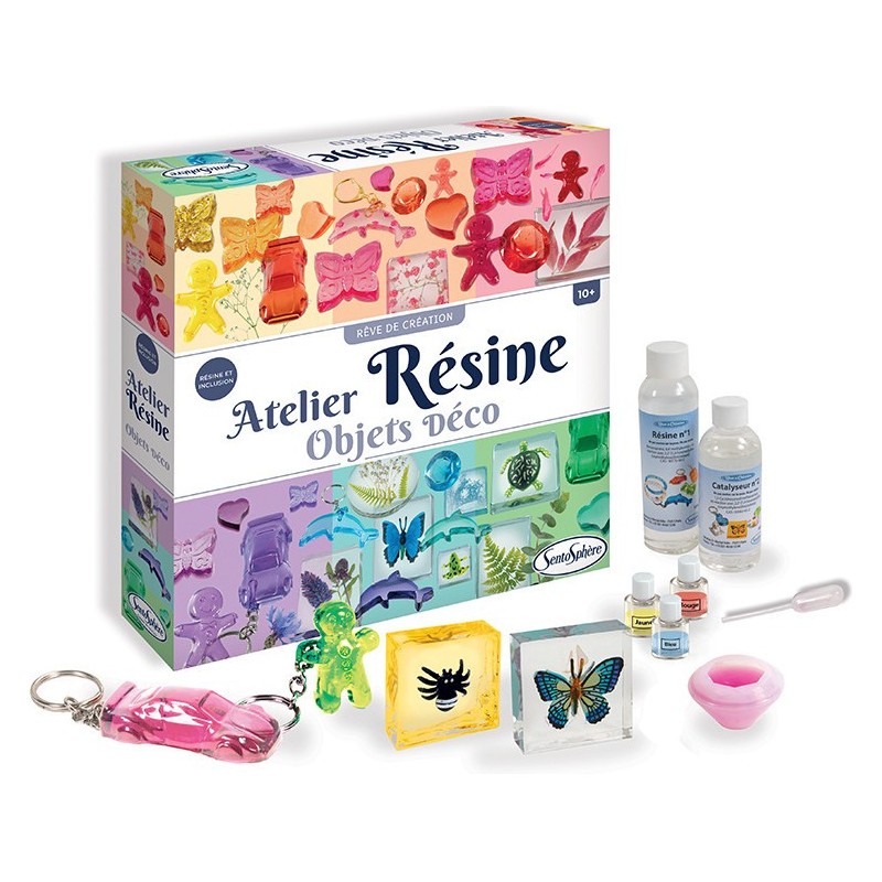L’Atelier Résine est Le coffret clé en main qui permet de réaliser de merveilleuses créations en résine avec des inclusions de petites feuilles irisées, de fleurs séchées, de coquillages ou d’insectes pour conserver ses plus beaux souvenirs !