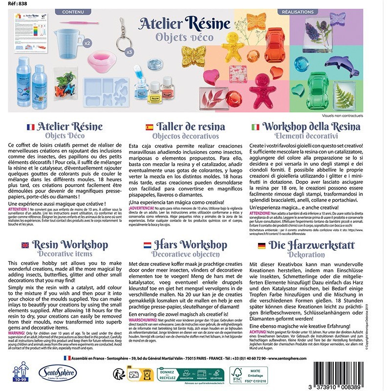 Ce coffret créatif permet de réaliser de merveilleuses créations en rajoutant des inclusions comme des insectes, des papillons ou des paillettes iridescentes ! Pour cela, il suffit de mélanger la résine et le catalyseur, d’éventuellement rajouter quelques gouttes de colorants puis de couler le mélange dans les différents moules. 20 heures plus tard, ces créations pourront facilement être démoulées pour devenir de magnifique presse-papiers, porte clef ou diamant ! Une expérience aussi magique que créative qui a pour seule limite l'imagination ! L’Atelier Résine a été élu parmi 55 nouveautés dans la catégorie « CrÉEr Et Imaginer » à l’occasion des Etoiles du Jouet. Ce coffret a remporté les votes des Médias pour la meilleure activité créative et manuelle ainsi que les votes des 155 familles présentes lors de l’événement.