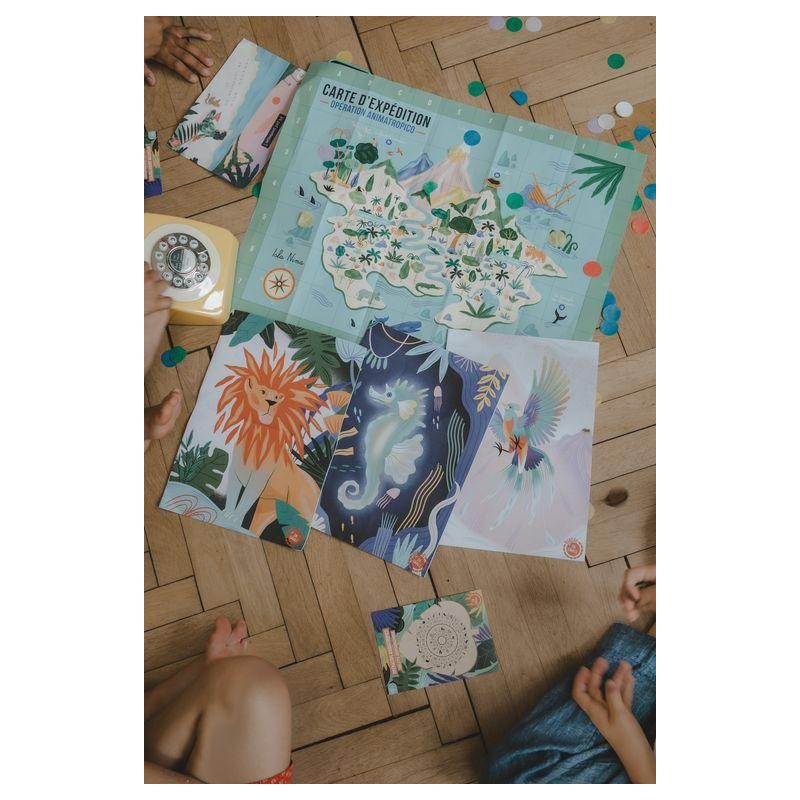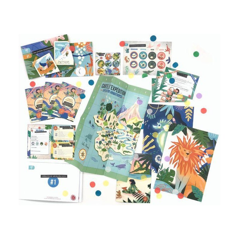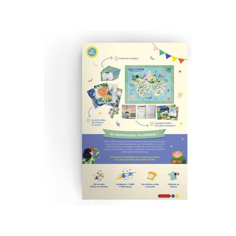 Contenu : 8 cartes d’invitations, 8 carnets d'enquête, 8 badges en bois, 1 carte d’expédition géante, 1 ballon de baudruche, 2 numéros de téléphone à appeler, 1 livret parent, 1 enveloppe avec des documents à cacher avant le début de l'aventure, 1 enveloppe avec des documents à donner aux Enfants Espions au démarrage de l'aventure