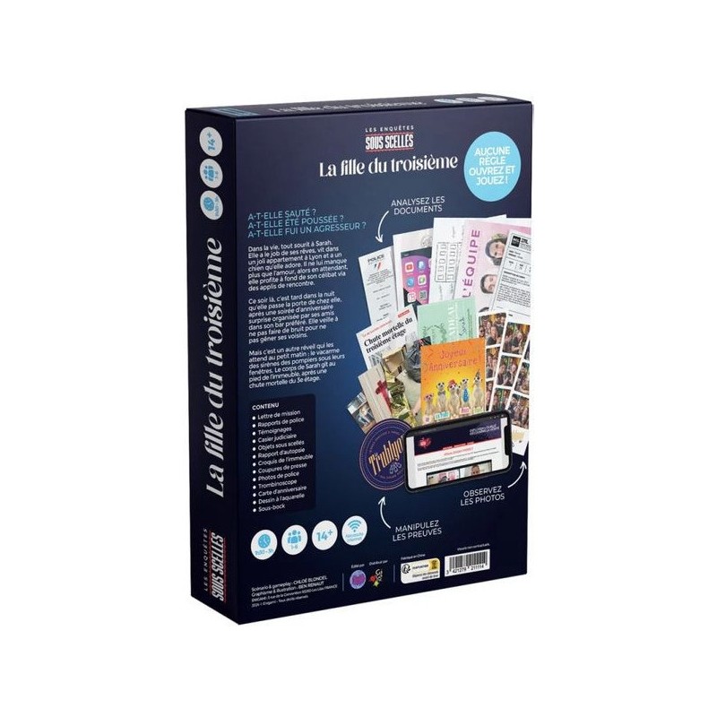La Fille du Troisième est un jeu d’enquête édité par Sous Scellés, qui vous plonge dans une affaire de meurtre mystérieuse. Vous devrez collaborer avec vos coéquipiers pour trouver des indices, interroger des suspects et résoudre des énigmes. Un jeu d’enquête immersif et coopératif pour 1 à 5 joueurs, à partir de 14 ans.