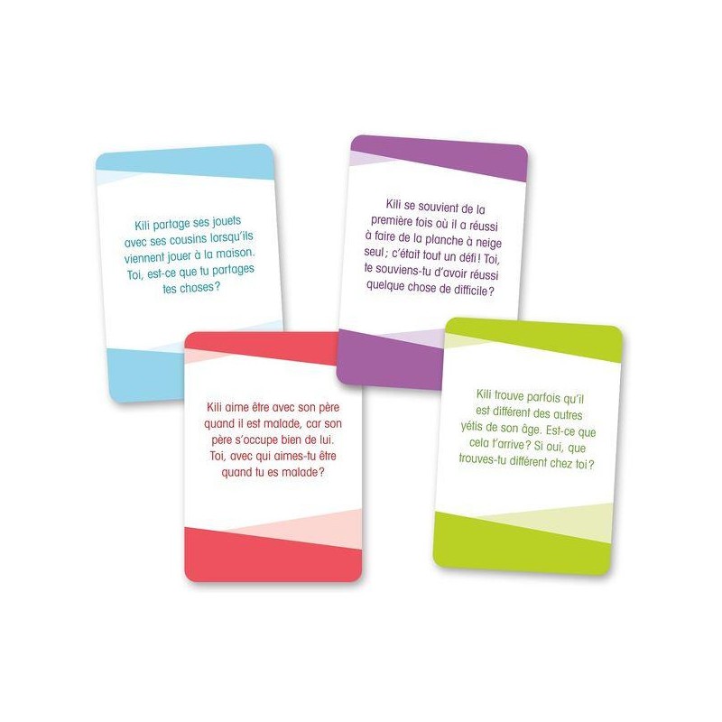 Jeu de parcours dans lequel les joueurs doivent répondre à des cartes-questions portant sur les composantes de l’estime de soi pour arriver le premier au sommet de la montagne. Après avoir construit la montagne en suivant les indications fournies, les joueurs font quatre piles de cartes-questions, faces cachées, en respectant les quatre catégories : connaissance de soi, sentiment de compétence, sentiment de confiance et sentiment d’appartenance. Chaque joueur choisit un pion-yéti et le place sur la table, près de la première case du parcours. À son tour, le joueur lance le dé et avance son pion du nombre de cases indiqué. Il prend une carte de la catégorie correspondante à la couleur de la case où son pion s’est arrêté. Il lit ensuite à voix haute la question qui y est indiquée et y répond. Le premier joueur qui rejoint Kili le yéti au sommet de la montagne est déclaré gagnant.
