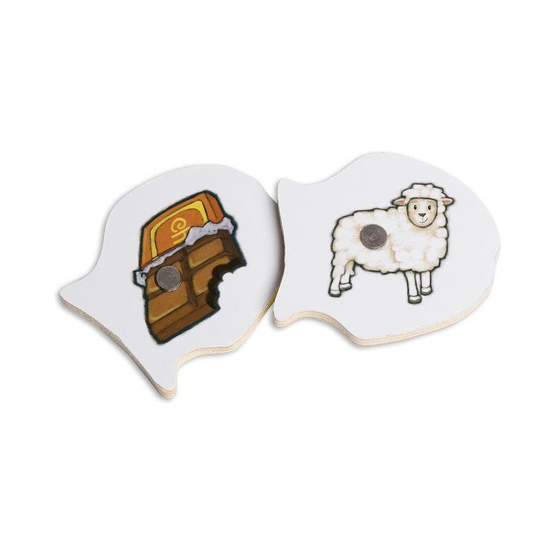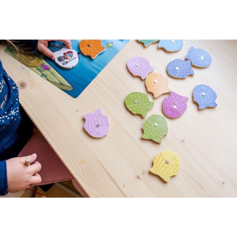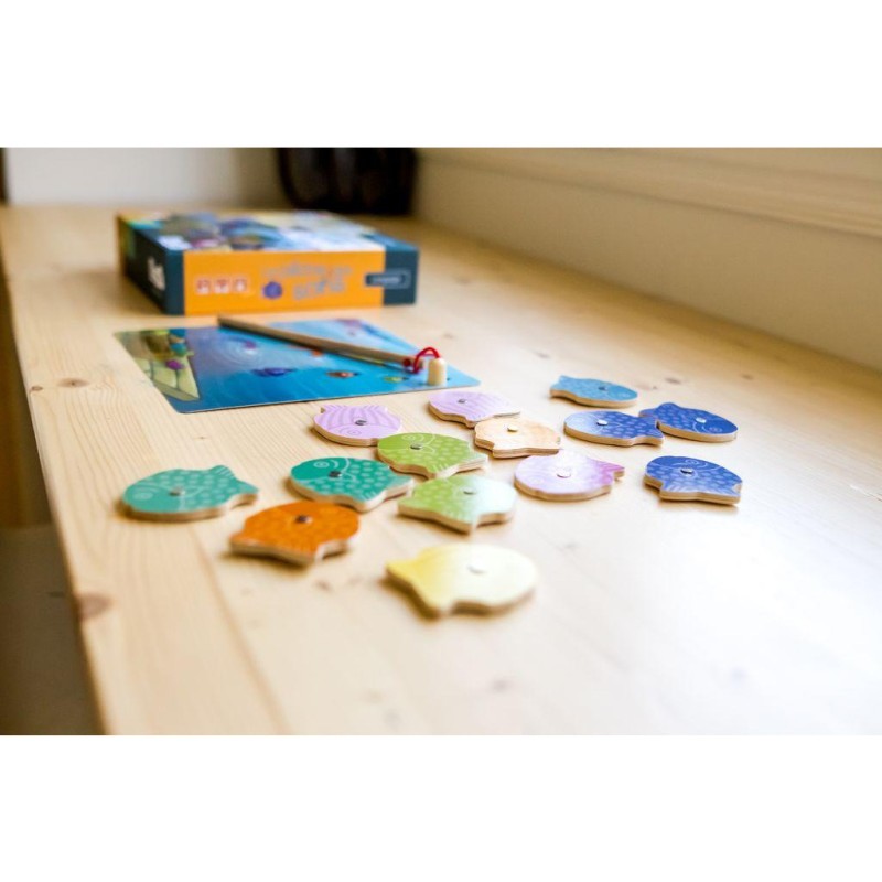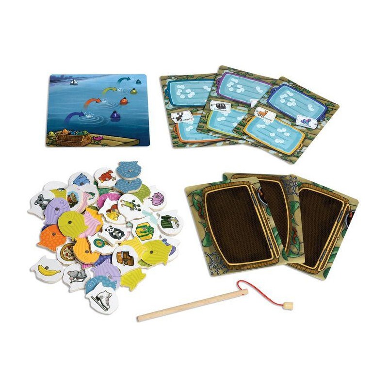 Contenu : , 48 poissons en bois aimantés, 1 canne à pêche, 1 planche « Cours d'eau », 6 planches de jeu : « Panier de pêche » au recto et « Glacières » au verso, 1 guide d'accompagnement, les règles du jeu