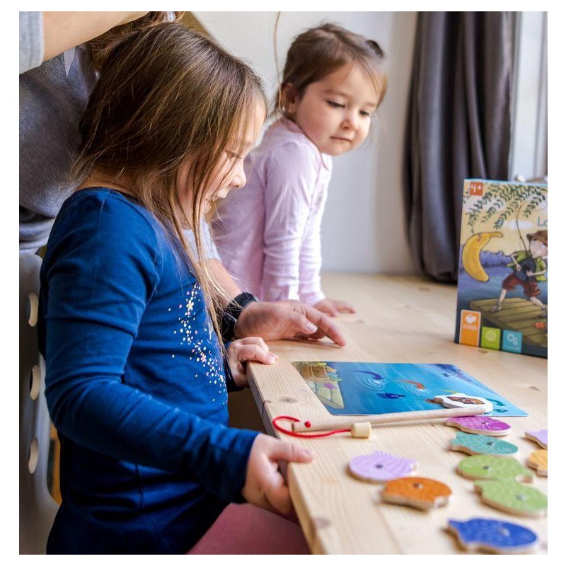 Jeu dans lequel les joueurs pêchent des poissons en bois à l’aide de la canne à pêche aimantée, pour ensuite les classer au bon endroit. Trois manières de jouer sont proposées selon l’objectif à travailler et l’habileté de l’enfant. La première (« les sauts de poisson ») met l’enfant au défi de compter le nombre de syllabes des mots illustrés sur les poissons à l’aide de la planche « Cours d’eau ». La seconde (« trouver l’intrus ») lui demande plutôt de trouver l’intrus qui ne commence pas par la même syllabe ou ne rime pas dans chaque groupe de 4 poissons présents dans un panier de pêche, puis de classer les intrus dans la bonne famille. Dans la troisième (« nourrir les animaux »), l’enfant compare la première ou la dernière syllabe du mot illustré sur chaque poisson avec celle des mots inscrits sur les glacières pour déposer les poissons dans la bonne glacière.