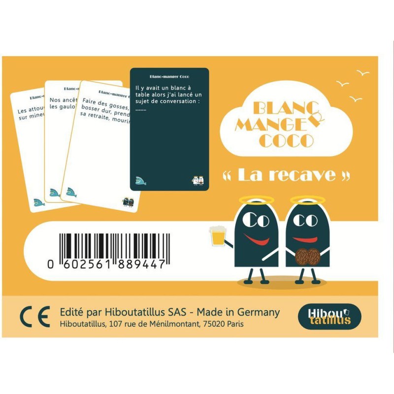 Elle a été la première extension initiée par Hiboutatillus pour le jeu Blanc Manger Coco. La Recave c’est 200 cartes supplémentaires dans l’esprit des Tome 1 et 2 (Le Déluge) de Blanc Manger Coco pour prolonger encore le plaisir. Pour rappel, pour l’emporter au jeu Blanc Manger Coco il vous faudra être le plus drôle possible en complétant la phrase à trou énoncée par le maître du jeu avec l’une de vos 11 cartes réponses dont vous disposez en mains. Les combinaisons de chaque joueur sont ensuite lues une à une par le "question master" qui en ignore l’auteur. Il désigne dans la foulée celle qu'il préfère, et permet à son auteur de remporter un point et de devenir "question master" à son tour.