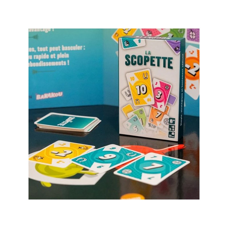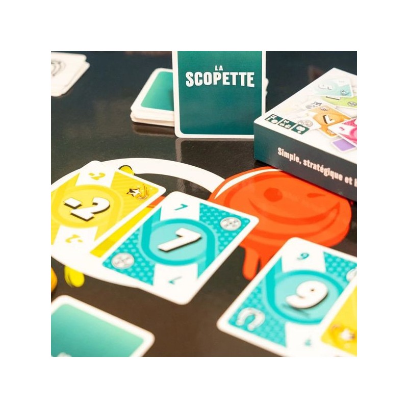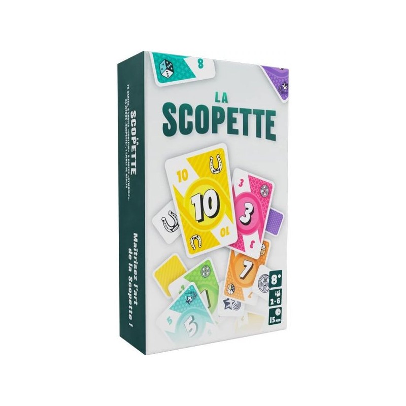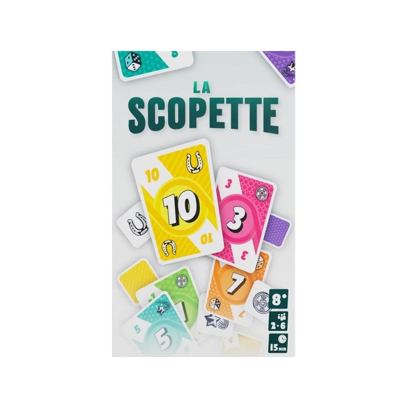 Combinez habilement vos cartes, surveillez votre couleur secrète et visez les bons symboles pourmarquer un maximum de points ! Videz la table ou votre main pour décrocher la Scopette et prendre l’avantage ! En 15 minutes, tout peut basculer : un jeu rapide et plein de rebondissements !