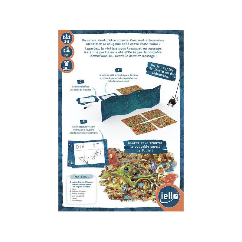 Le coupable, de son côté, va tout faire pour perturber le message de la victime. Il a donc la possibilité d’effacer des cases de l’ardoise, pour rendre le message bien plus difficile à comprendre ! Plus la partie avance, moins il pourra effacer de cases et plus le message de la victime parviendra aux enquêteurs de manière lisible. Mais attention : les enquêteurs ne disposent que de 4 manches pour trouver le coupable !