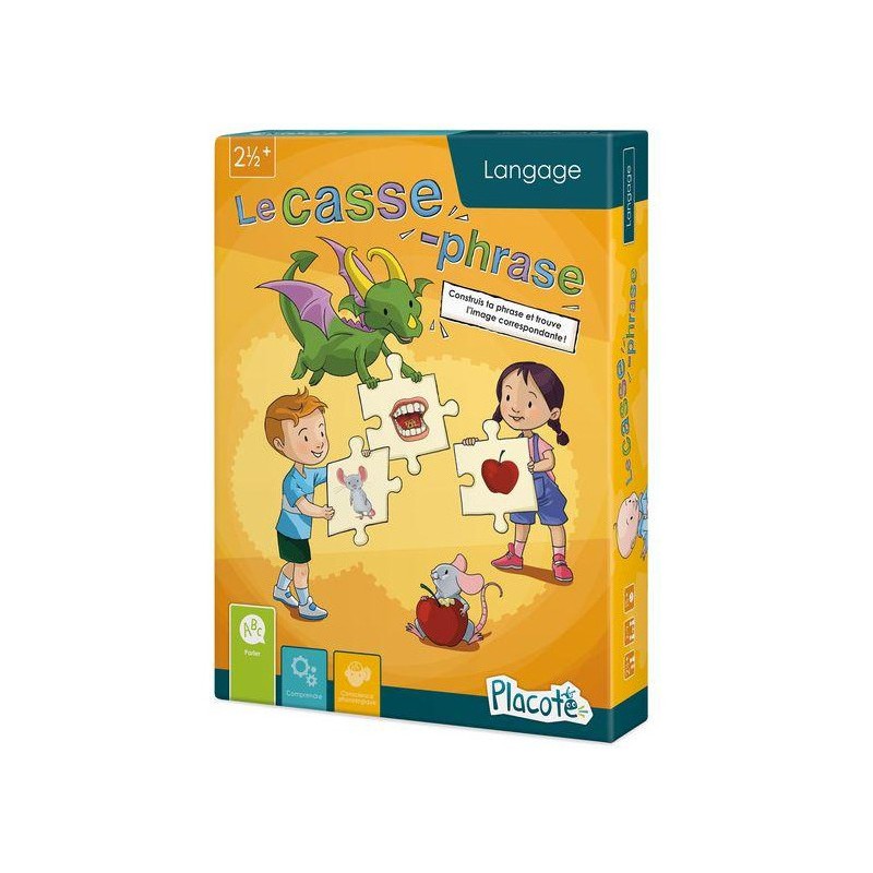 Le Casse-phrase est un jeu éducatif spécialement conçu pour les enfants âgés de 2½ ans à 4½ ans afin de les aider à développer leurs compétences en construction de phrases complètes. Grâce à une approche ludique et interactive, les enfants découvrent les bases de la syntaxe et apprennent à assembler les éléments essentiels d'une phrase : le sujet, le verbe et le complément.