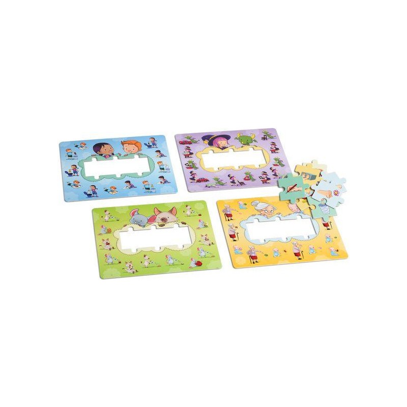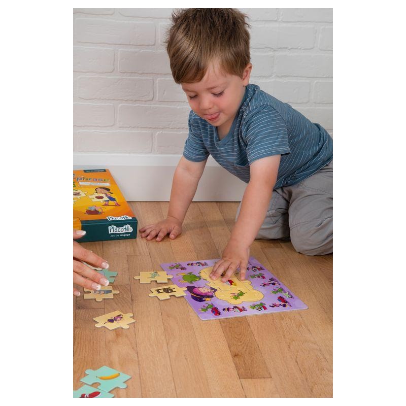 Jeu dans lequel l’enfant assemble des morceaux de casse-tête pour apprendre à faire des phrases complètes comprenant un sujet, un verbe et un complément. Les joueurs choisissent une des quatre planches de jeu et prennent les morceaux de casse-tête associés. L’enfant choisit un morceau « Sujet », un morceau « Verbe » et un morceau « Complément » pour compléter le casse-tête et former sa phrase. Il tente ensuite de dire la phrase complète, puis il cherche l’illustration correspondant à la phrase sur la planche de jeu. L’enfant peut ensuite choisir d’autres morceaux pour construire une nouvelle phrase ou changer de planche de jeu. Le jeu se termine lorsque l’enfant le décide.