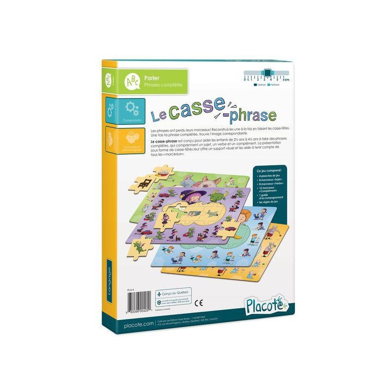 Le casse-phrase est conçu pour aider les enfants de 2½ ans à 4½ ans à faire des phrases complètes, qui comprennent un sujet, un verbe et un complément. La présentation sous forme de casse-têtes leur offre un support visuel et les aide à tenir compte de tous les «morceaux».