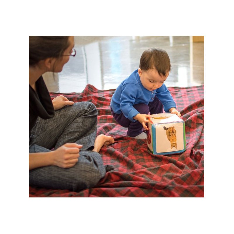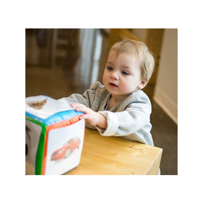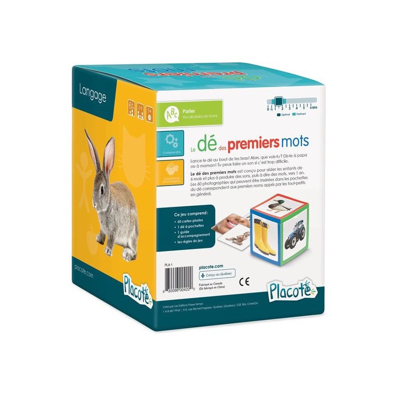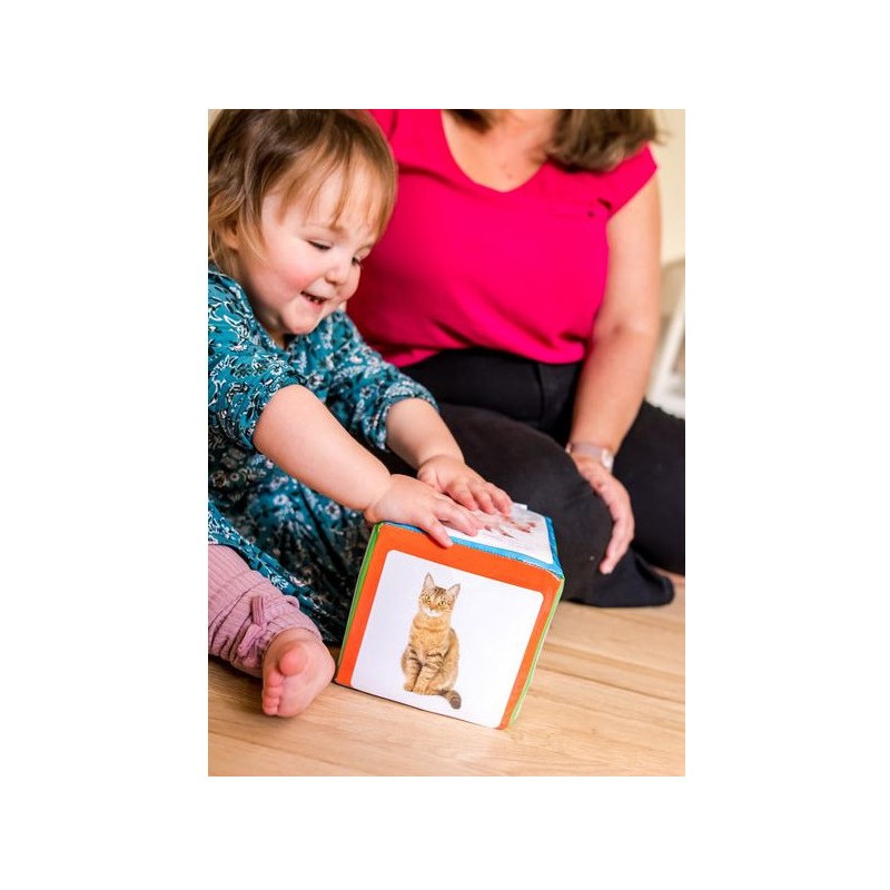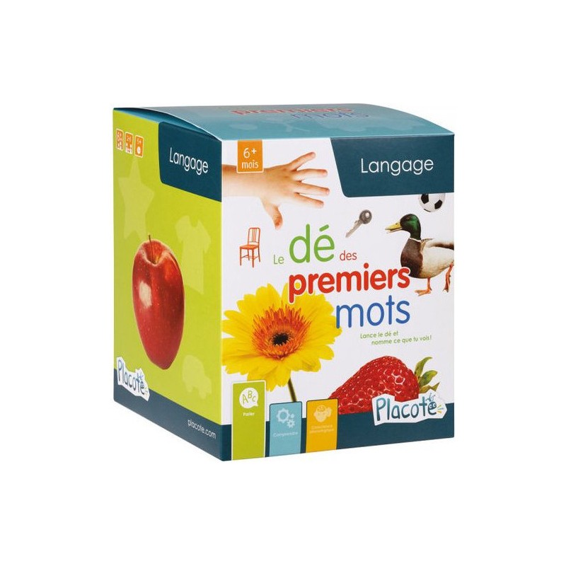 Le dé des premiers mots est conçu pour aider les enfants de 6 mois et plus à produire des sons, puis à dire des mots, vers 1 an. Les 60 photographies qui peuvent être insérées dans les pochettes du dé correspondent aux premiers noms appris par les tout-petits en général.