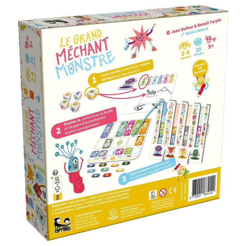 Dans Le Grand méchant monstre, il faut choisir ses dés pour dessiner son monstre petit bout par petit bout, mais également savoir quand s'arrêter pour prendre un jeton Peur et le placer dans le Trouillomètre. Le premier à dépasser la jauge gagne la partie et devient le Grand méchant monstre !