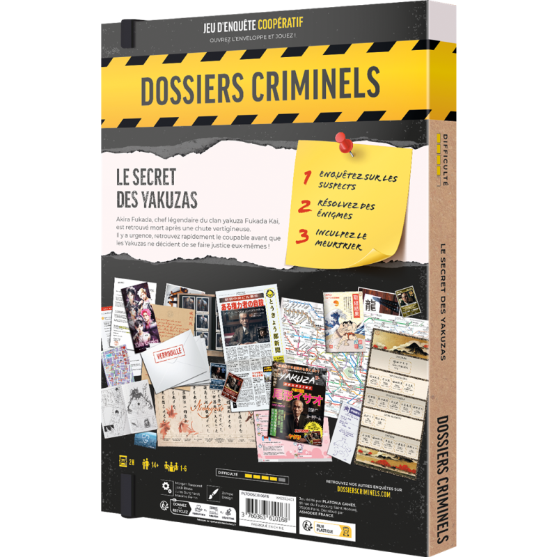 Akira Fukada, chef légendaire du clan yakuza Fukada Kai, est retrouvé mort après une chute vertigineuse. Il y a urgence à retrouver le coupable de ce meurtre, avant que les yakuzas ne décident de se faire justice eux-mêmes et que leurs affrontements ne mettent Tokyo à feu et à sang. Ce dossier criminel contient tous les éléments pour résoudre ce meurtre. Un guide des fouilles, des transparents de la vallée des rois, des papyrus, un article de presse, des croquis, des contenus audio… etc. Travaillez ensemble pour résoudre les énigmes qui permettront d’éclaircir ce mystère et d’ouvrir les 4 enveloppes contenant des preuves supplémentaires. Un accès à internet est nécessaire afin de débloquer plusieurs bases de données. Plusieurs niveaux d’indices sont disponibles sur le site afin que vous ne restiez pas bloqué dans cette enquête de difficulté 4 sur 5.