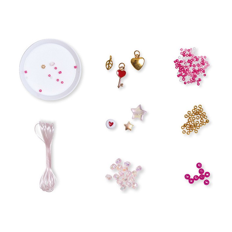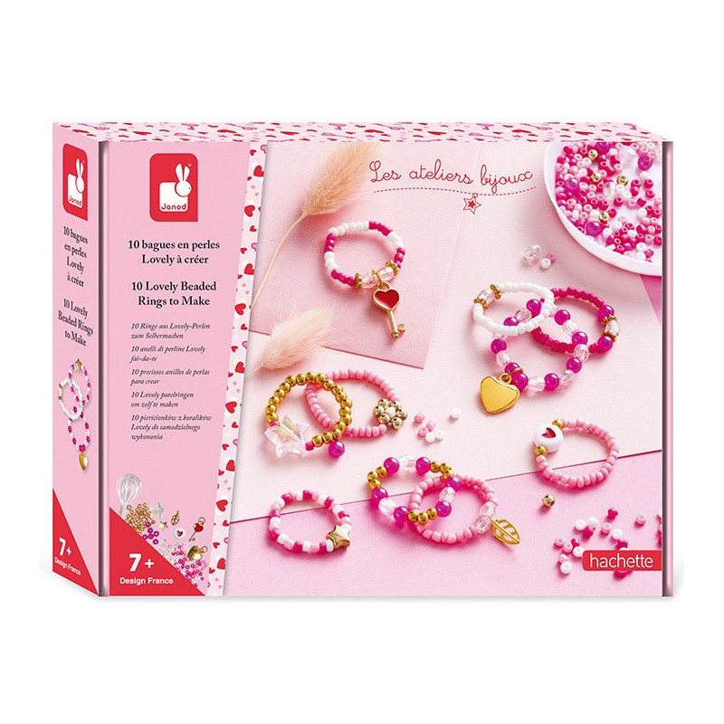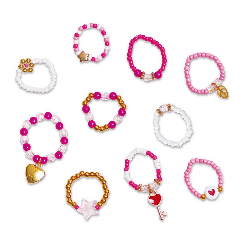 Créez d'adorables bijoux ! Avec ce kit créatif, les enfants de 7 ans et plus réalisent 10 bagues en perles dans un style adorable. Du rose, du doré, des cœurs, des étoiles … Pour un rendu vraiment romantique ! Cette activité de création de bijoux en perles est idéale pour stimuler la dextérité des enfants et leur permettre d'exprimer leur créativité. Et quel plaisir de porter fièrement ses propres bijoux faits main ! Sur tous les doigts, en accumulation ... C'est une véritable vague de glamour ! L'atout de ce coffret créatif, c'est le fil élastique : idéal pour que les bagues puissent être portées à tous les doigts et facilement enfilées ou retirées. Complet, cet atelier bijoux propose également une coupelle très pratique pour manipuler facilement les perles sans risquer de les perdre. Ce coffret de loisir créatif contient : 300 perles de rocaille, 40 perles dorées, 16 perles à facettes transparentes, 15 perles irisées roses, 6 perles intercalaires, 3 breloques, 2 perles étoiles, 1 perle imprimée cœur, du fil élastique et 1 coupelle. Pour guider les enfants dans la création de leurs charmantes bagues, un livret avec modèles et instructions et également inclus. Il faudra compter environ 10 minutes pour créer chaque bague.