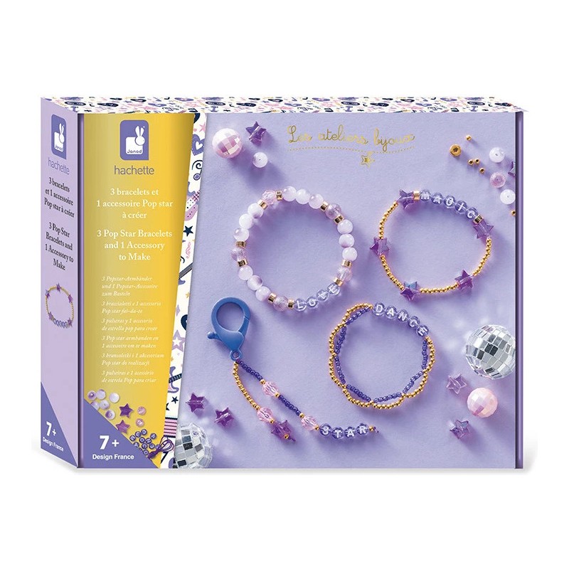 Des bijoux Pop Star à créer pour briller sous les projecteurs ! Ce coffret créatif permet de réaliser 4 bracelets tendance et 1 porte-clés unique, parfaits pour afficher son style de star. Les enfants dès 7 ans pourront suivre les étapes illustrées dans le livret pour reproduire les modèles proposés… ou inventer leurs propres créations !