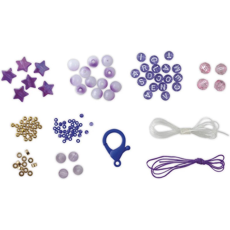Amusez-vous à composer des mots avec les 18 perles lettres, ajouter une touche brillante avec les perles étoiles, et jouer avec les couleurs grâce aux perles rondes, à facettes et transparentes. Votre enfant peut aussi y ajouter les perles dorées pour un look encore plus glamour ! Le coffret contient tout le nécessaire : 120 perles rondes en métal, 60 perles bleues, 12 perles en métal, 4 perles à facettes, 4 perles transparentes, 12 perles mauves transparentes, ainsi que du fil élastique, du fil de jade coloré et un mousqueton en plastique pour le porte-clés.