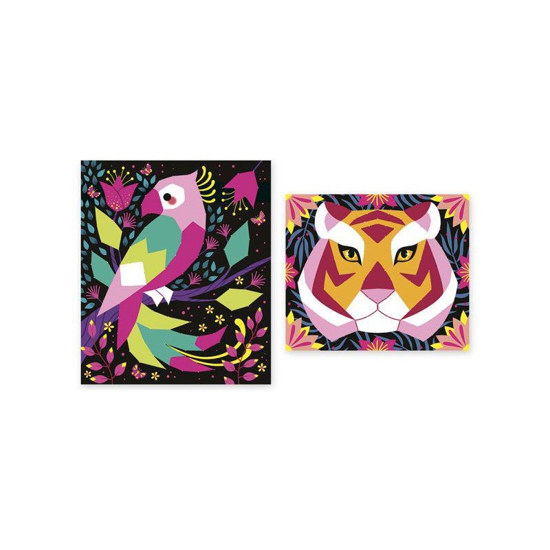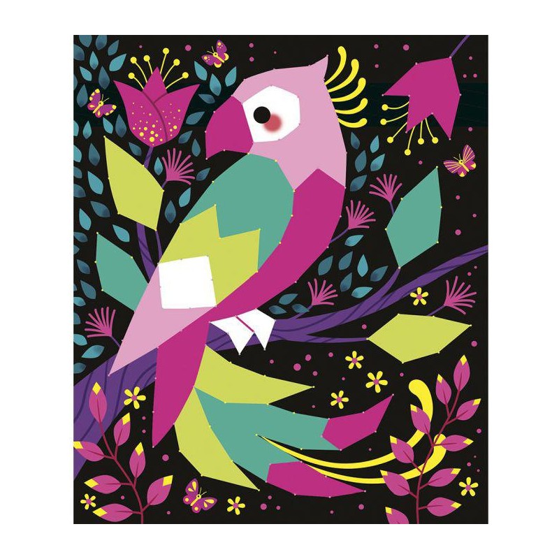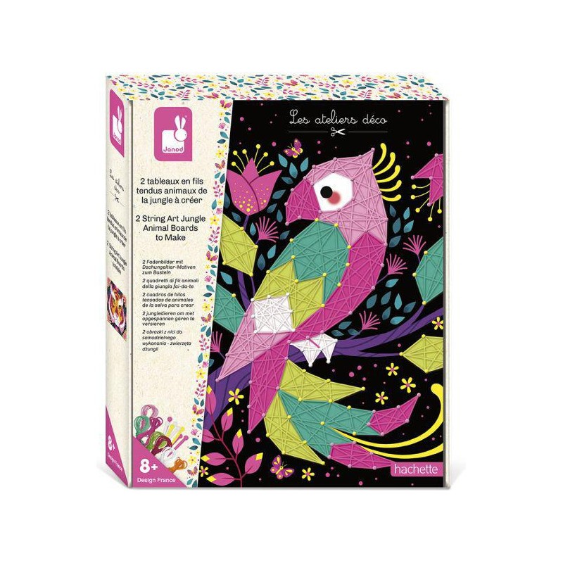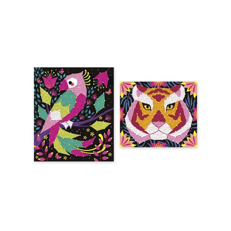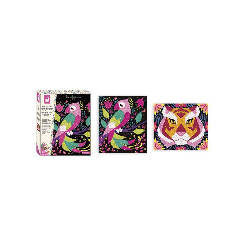 Connaissez-vous les fils tendus ? Cette technique très facile permet aux enfants à partir de 8 ans de reproduire de jolis tableaux grâce à des fils de différentes couleurs à tendre de clou en clou en suivant le livret d'instructions fourni. Ce loisir créatif de la gamme Les Ateliers Déco permet d'obtenir 2 jolis tableaux en relief et de différentes tailles et de développer ainsi minutie et dextérité chez les petits créateurs. Avec un peu de patience et de concentration, 2 magnifiques têtes d'animaux verront le jour, un majestueux tigre et un flamboyant perroquet ! On place les clous de couleurs comme indiqué sur les tableaux en mousse puis on fait passer les bons fils (7 couleurs différentes) dans les zones dédiées. Les couleurs vives des impressions sont du plus bel effet ! Il faudra environ 3h pour réaliser chacun des deux tableaux.