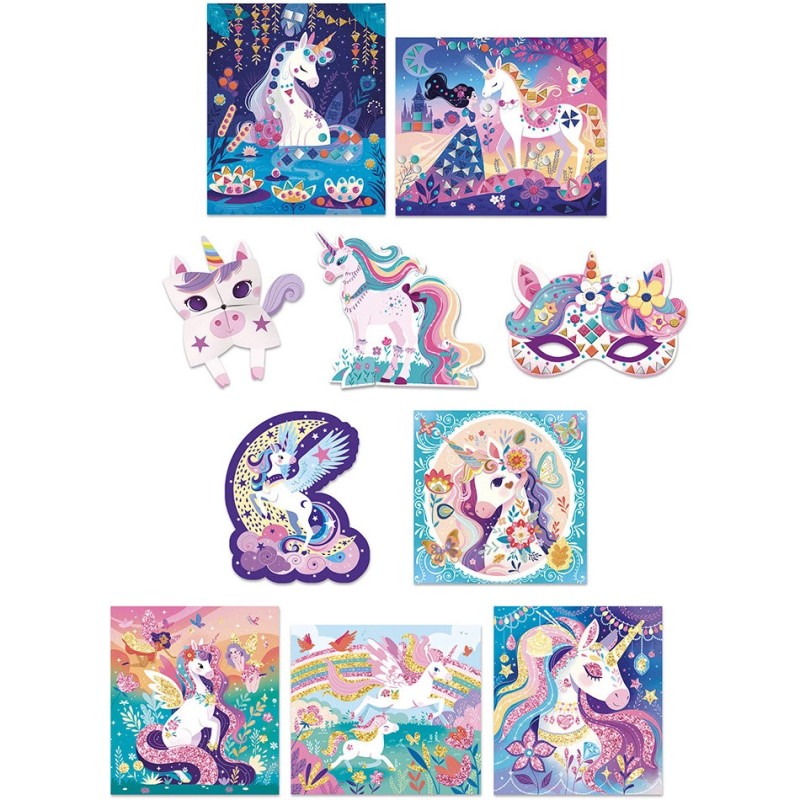 En selle pour l’aventure magique ! Avec ce coffret créatif multiactivités, les enfants dès 7 ans vont réaliser 10 créations sur le thème des licornes. Grâce à plusieurs techniques, ils découvrent un univers enchanté rempli de couleurs, de paillettes et de magie ! Ils pourront décorer un masque avec des mosaïques et des stickers brillants, embellir des tableaux avec des demi-perles, des mosaïques ou des paillettes, gratter des cartes découpées pour révéler de jolis motifs, personnaliser un portrait de licorne avec des éléments en 3D et même plier une cocotte en papier licorne. Un livret d’instructions est inclus pour guider les petits créatifs pas à pas. Ce coffret propose 6 activités manuelles différentes : pliage, grattage, collage de demi-perles, de paillettes, de mosaïques, de stickers et d'éléments 3D. Un loisir créatif complet sur le thème de ces créatures féeriques ! On garde ses tableaux et cartes pour décorer la chambre, on pose des questions rigolotes avec la cocotte en papier et on se déguise en licorne aux pouvoirs magiques avec le masque décoré soi-même. Ce kit peut être partagé entre plusieurs enfants pour créer ensemble, développer leur dextérité et leur sens artistique. Le coffret multiactivités Licornes appartient à la collection "Les Ateliers du Calme", parfaite pour proposer un temps relaxant à votre enfant. Bienvenue dans ce monde merveilleux !