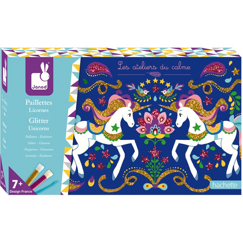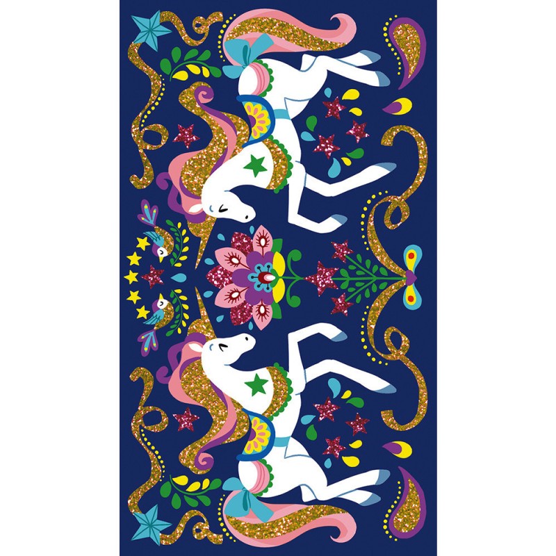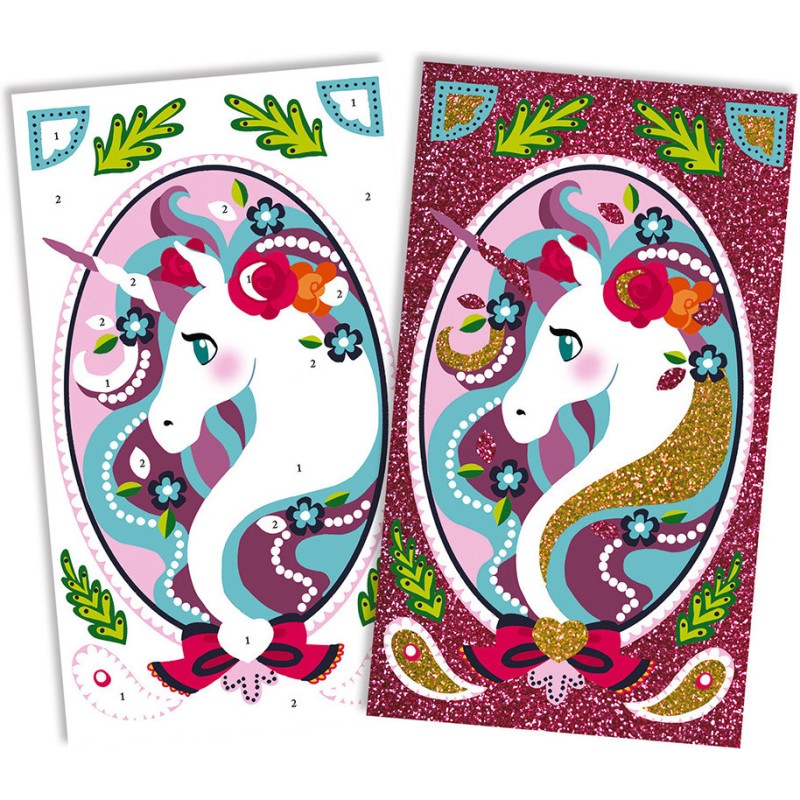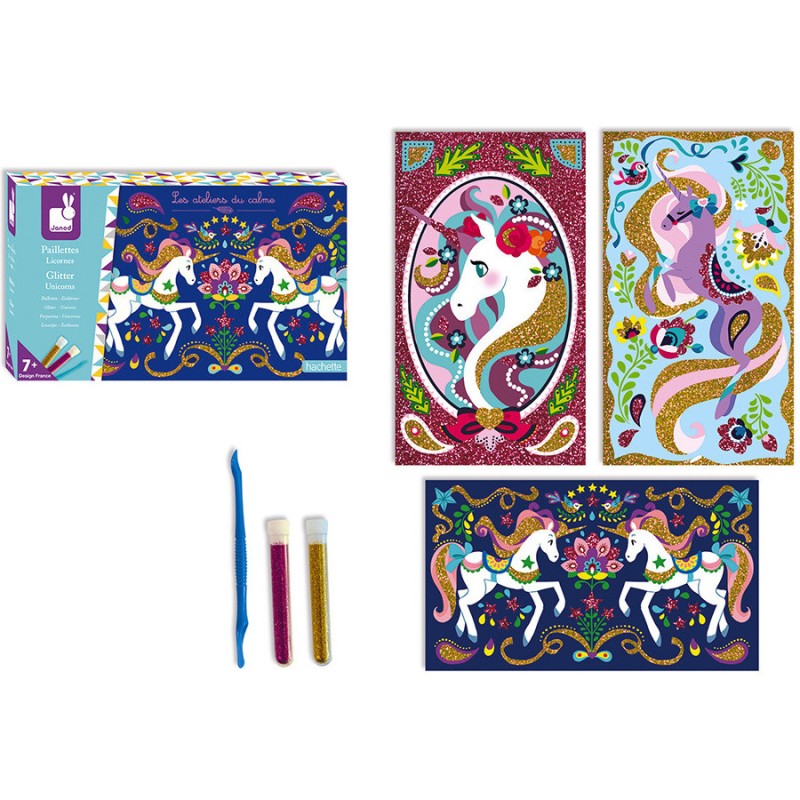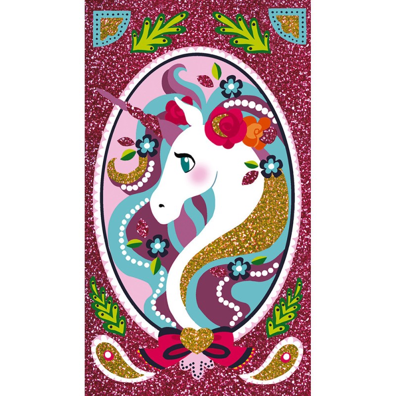 Ce kit créatif permet de réaliser de jolis tableaux avec d'adorables licornes ! Pour cela, il suffit de décorer les cartes en soulevant la partie prédécoupée avec l'outil prévu à cet effet puis de saupoudrer de paillettes. Issu de la collection "Les Ateliers du Calme", ce kit contient : 3 tableaux autocollants à décorer, 2 tubes de paillettes, 1 spatule et 1 livret avec modèles avec instructions.
