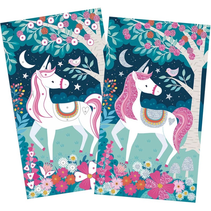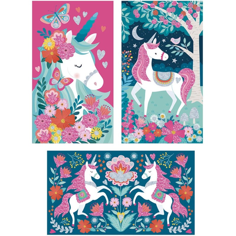 Attention, pluie de paillettes en vue ! Les enfants à partir de 6 ans vont pouvoir donner vie à de jolies licornes et à leur décor enchanté ! Ce kit créatif permet d'ajouter facilement des paillettes de 2 couleurs différentes à 3 tableaux. Le principe est super simple : à l'aide de la spatule, il faudra décoller les parties autocollantes afin de pouvoir y appliquer les jolies paillettes brillantes !