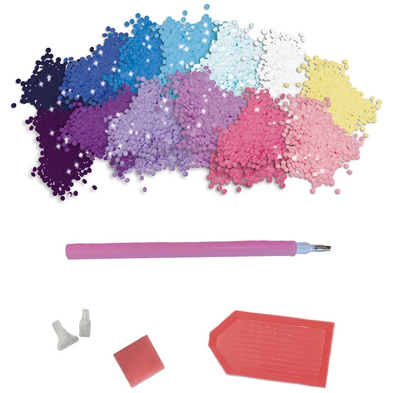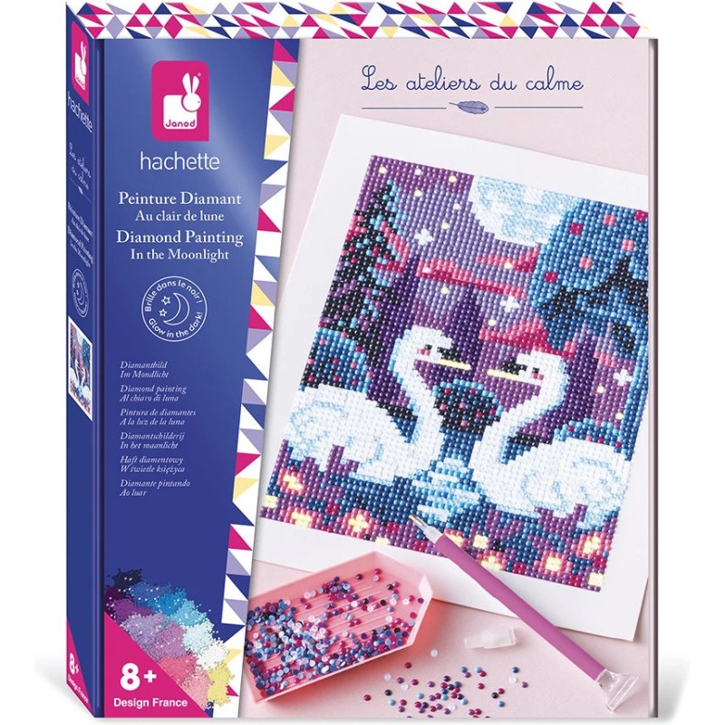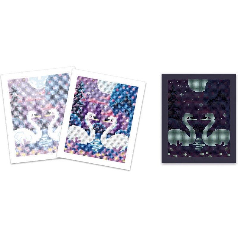 Qu'ils sont beaux ces deux cygnes au clair de lune ! Délicatesse et précision sont au rendez-vous avec ce kit créatif de peinture diamant, idéal pour les enfants dès 8 ans ! Avec cette technique, inutile d’utiliser aquarelle et eau : de petits strass scintillants permettent de composer un tableau aux détails très raffinés. Cette activité dure environ 3h et stimule la créativité et la motricité fine, tout en développant la patience. Un livret, présent dans le kit créatif, guide étape par étape la réalisation du modèle. Ce coffret permet ainsi de décorer 1 tableau à l’aide de mini-strass de couleurs variées. L’enfant commence par verser les mini-strass dans le plateau rainuré pour les aligner et faciliter leur manipulation. Il prépare ensuite le stylet en appuyant sa pointe dans le carré de gomme : cela dépose une petite quantité de matière qui rend la pointe légèrement collante. Trop pratique, le stylet est doté de plusieurs embouts de différentes tailles, lui permettant d'attraper plusieurs strass en même temps ! Votre enfant peut ainsi coller chaque diamant sur le tableau. Peu à peu, le couple de cygnes et le magnifique décor qui les entoure prennent vie, pour émerveiller toute la famille ! Ce tableau est accompagné d'un cadre à construire à partir de la boite pour magnifier la création. Même dans le noir, vous pourrez admirer les cygnes grâce aux strass phosphorescents : un joli spectacle pour les yeux avant l'heure du coucher ! Issu de la collection "Les Ateliers du Calme", ce kit contient : 1 tableau autocollant (20,7 x 24,4 cm), 3900 strass (14 couleurs dont 3 couleurs phosphorescentes), 1 stylet, 1 carré de cire, 1 plateau rainuré et 1 livret explicatif.
