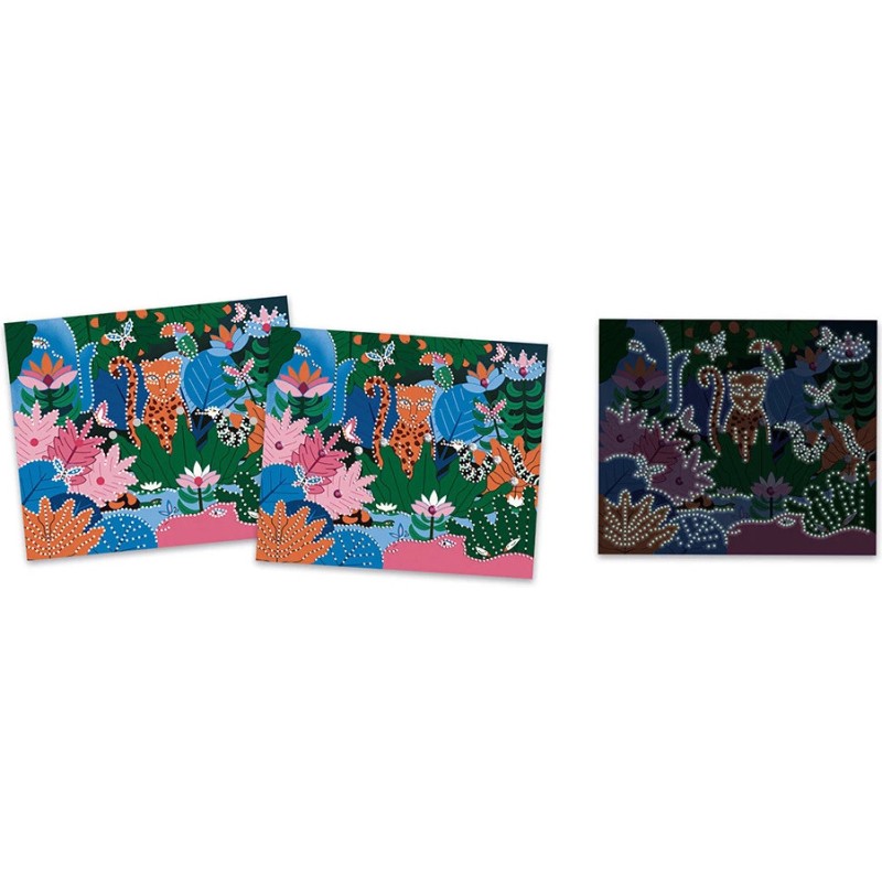 La nuit enveloppe la jungle et les animaux sauvages s’éveillent ! Donnez vie à ce décor nocturne en le parant de strass colorés pour en faire un univers scintillant et mystérieux. Le kit comprend aussi une planche de stickers à personnaliser avec cette même technique créative. Cette pochette, qui fait appel au diamond painting, est idéale pour les enfants à partir de 5 ans.