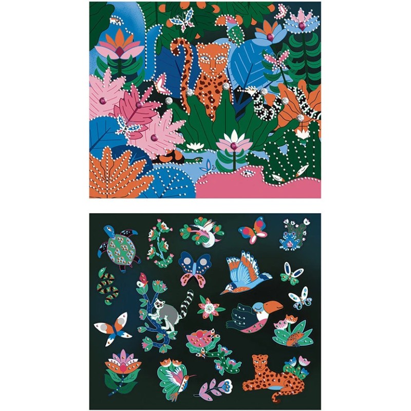 Cette activité dure environ 1h40 et stimule la créativité et la motricité fine, tout en développant la patience. Un livret, présent dans le set, guide étape par étape la réalisation des modèles. Ce coffret créatif permet ainsi de décorer 1 tableau et des stickers sur le thème de la jungle à l’aide de strass autocollants de tailles et de couleurs variées.