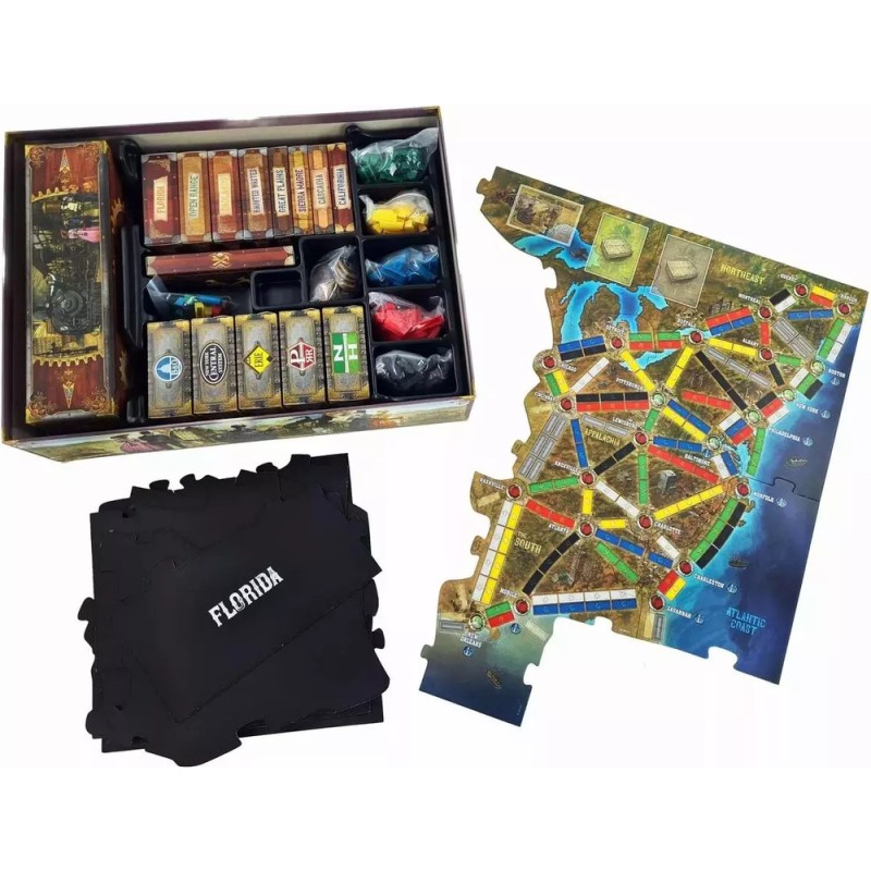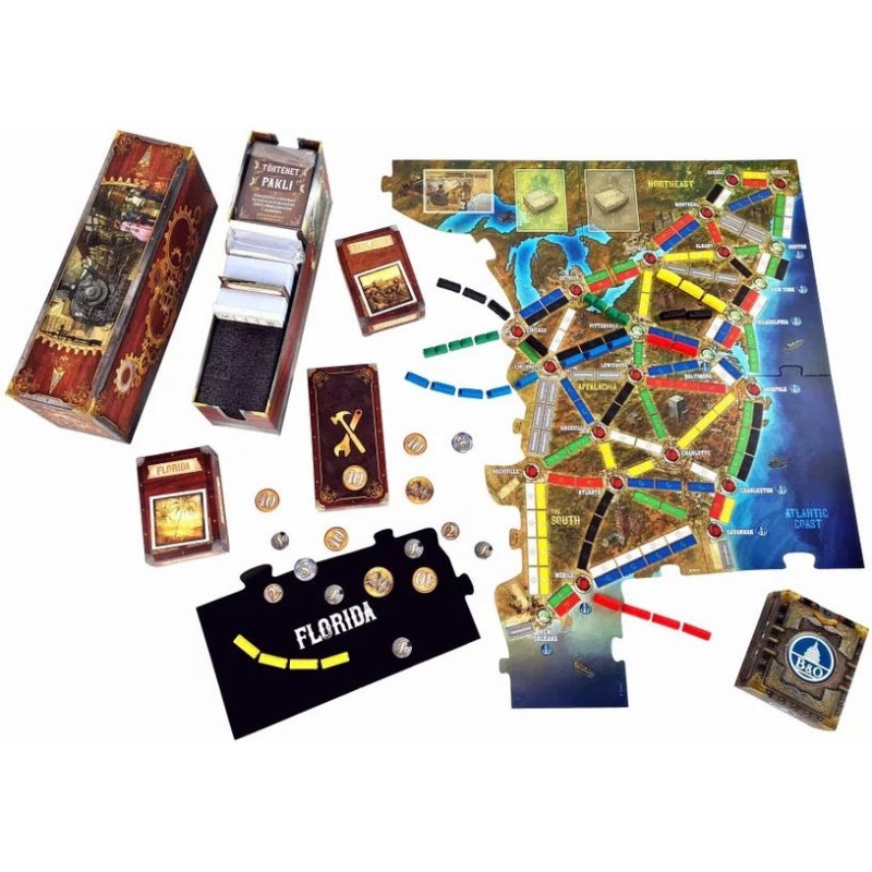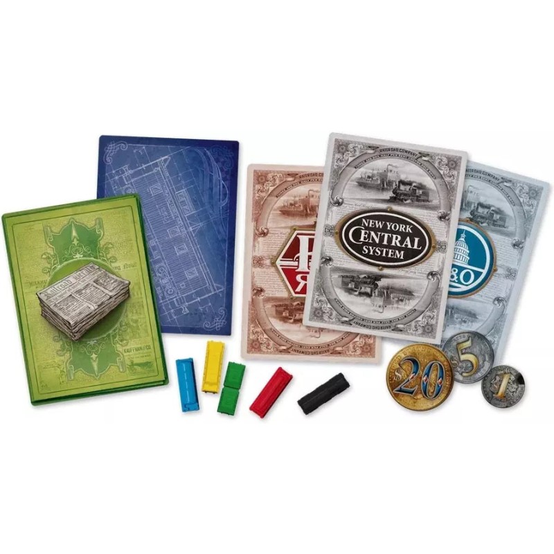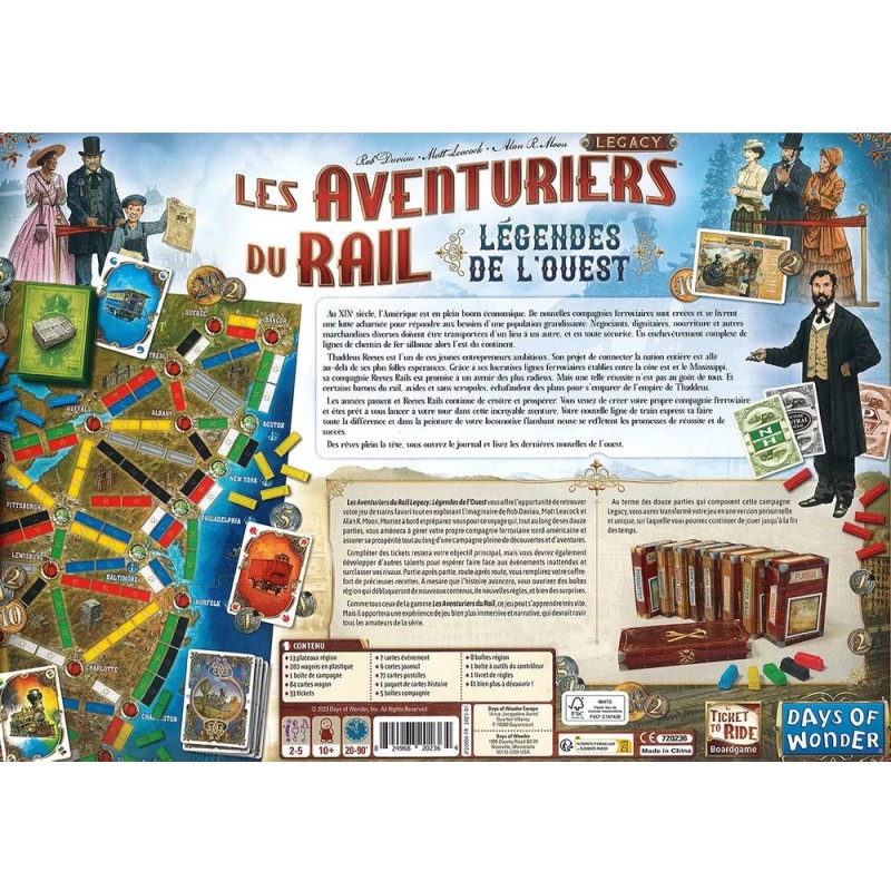 Cette édition des Aventuriers du rail est un jeu de type « Legacy » (héritage). À chacune des 12 parties, vous ajouterez de nouvelles règles, du matériel de jeu, vous agrandirez le plateau, etc. À l’issue de la campagne, votre exemplaire sera personnel et unique. Vous pourrez continuer à y jouer jusqu’à la fin des temps. Contenu