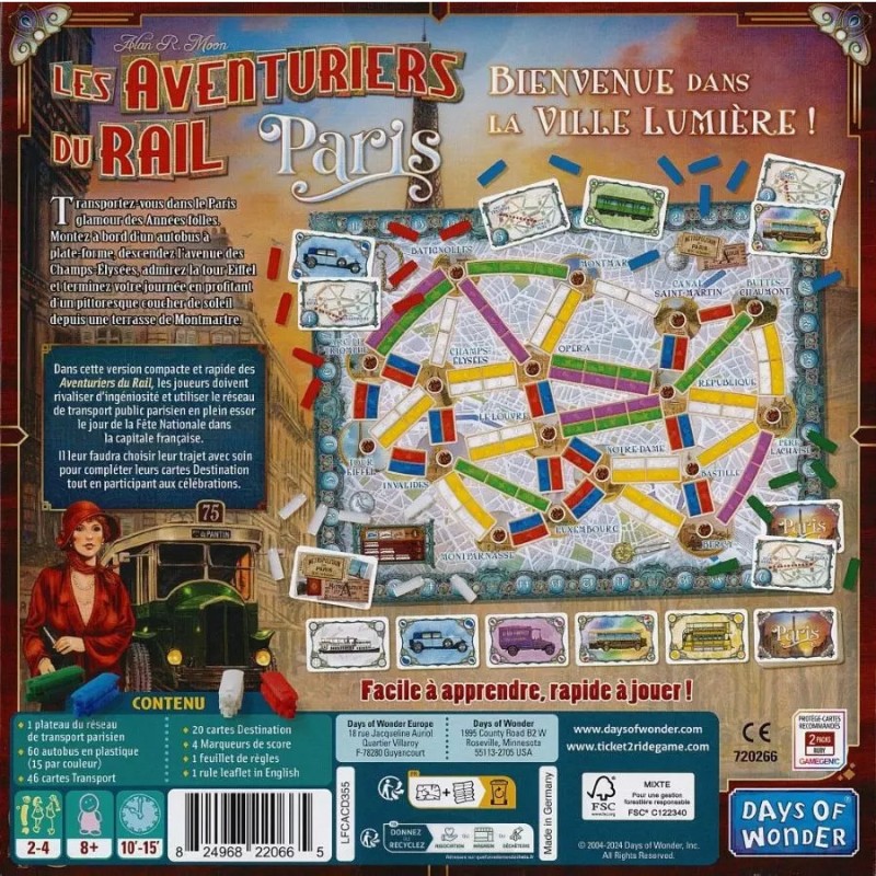 Une nouvelle déclinaison des célèbres Aventuriers du rail. Partez pour le Paris des années 30. Complétez vos destinations en parcourant la ville lumière pour relier les différents monuments. Des parties de 15 minutes pour toute la famille, débutants comme confirmés, au sein d’un Paname d’il y a près de 100 ans.
