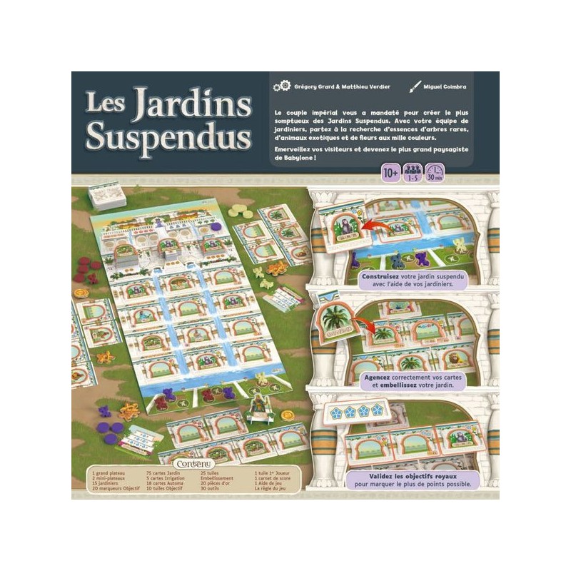 Vous incarnez un paysagiste chargé par le roi de Babylone Nabuchodonosor Ii d’aménager les jardins suspendus pour la reine Amytis. Au cours des 4 manches de la partie, vous devez utiliser au mieux votre équipe de jardiniers pour réaliser le jardin suspendu qui plaira le plus au couple royal, c’est-dire en marquant plus de points de victoire que vos adversaires.