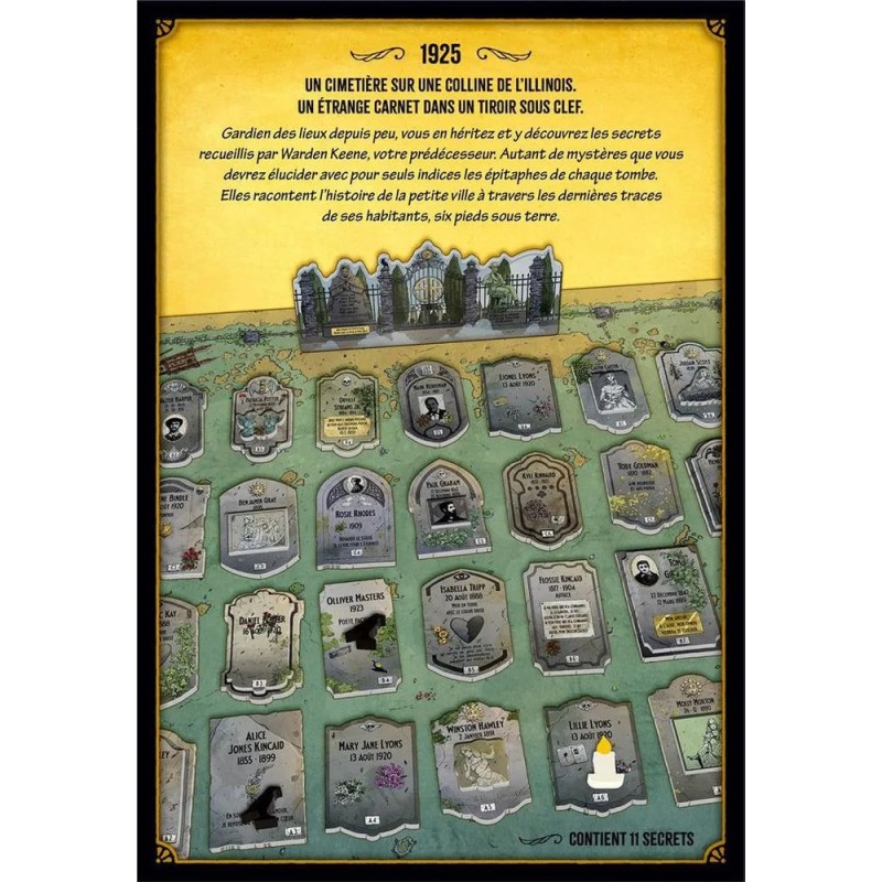 Les Secrets de Warden Keene est un jeu d’enquête original qui vous entraîne dans l’atmosphère mystérieuse et troublante du cimetière de Spoon River. Ici reposent des habitants dont les destins brisés et les rancunes inassouvies ne cessent de perturber leur sommeil éternel. Vous incarnez le lecteur du journal du gardien, Warden Keene, qui a méticuleusement consigné les récits et les secrets des lieux. À vous de faire parler les pierres tombales et de révéler la vérité enfouie dans ces histoires tragiques.