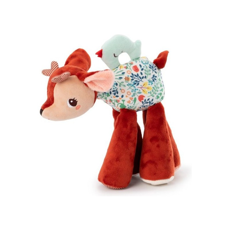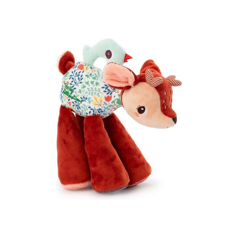 La touche magique Lilliputiens ? Le petit oiseau fait office de poignée sur le dos de la peluche, pour facilement la transporter ou l'agiter ! Sur une face, il a l'œil grand ouvert, mais il s'est endormi sur l'autre face. Un faon sonore en peluche, c'est l'idée cadeau idéale pour offrir un ami câlin avec plein de petits plus.