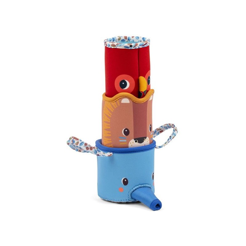 Ce que préfère Jack quand ils va se baigner, c’est éclabousser ! Avec son fidèle ami Gilles le perroquet et leur copain l'éléphant, les voilà tous les trois partis pour une chouette session d’arrosage à l’heure du bain. Ce jouet de bain convient aux bébés dès l’âge de 6 mois et aux enfants jusqu’à 6 ans et plus. Il se compose de trois gobelets, avec différents jets d’eau, pour s’éclater dans la baignoire ! D’abord, Jack le lion vous arrose par le museau grâce à l’ouverture qui se trouve juste sous son nez. Ensuite, c’est au tour de l'éléphant : en l'attrapant par ses grandes oreilles rigolotes, qui servent aussi de poignées, il vous aspergera par sa trompe comme un arrosoir ! Enfin, Gilles le perroquet vous arrose sur la tête, grâce à ses ouvertures situées par dessous ! Ce jeu d’arrosage n’a pas fini d’attiser la curiosité de bébé, et de développer la motricité des bambins ! Votre enfant va adorer encastrer les gobelets et découvrir les différents jets d’eau. Pratique, ce set de seaux pour le bain se compose de néoprène et de polyester : il sèche facilement et rapidement. Ils sont aussi encastrables, pour un rangement toujours plus aisé. Que ce soit pour se laver ou s’amuser dans l’eau par une chaude journée, ce jeu d’eau Lilliputiens promet de longues heures de fun ! C’est idéal pour stimuler la coordination et la motricité, mais aussi encourager la découverte des plus petits. Pour favoriser l’autonomie des plus grands, on peut utiliser ces gobelets de bain pour se rincer avant de sortir de l’eau. Dans leur format 12 x 8,5 cm, ces gobelets de bain en tissu se rincent à l’eau claire et doivent sécher après chaque utilisation. Au besoin, vous pouvez les laver en machine à 30°.