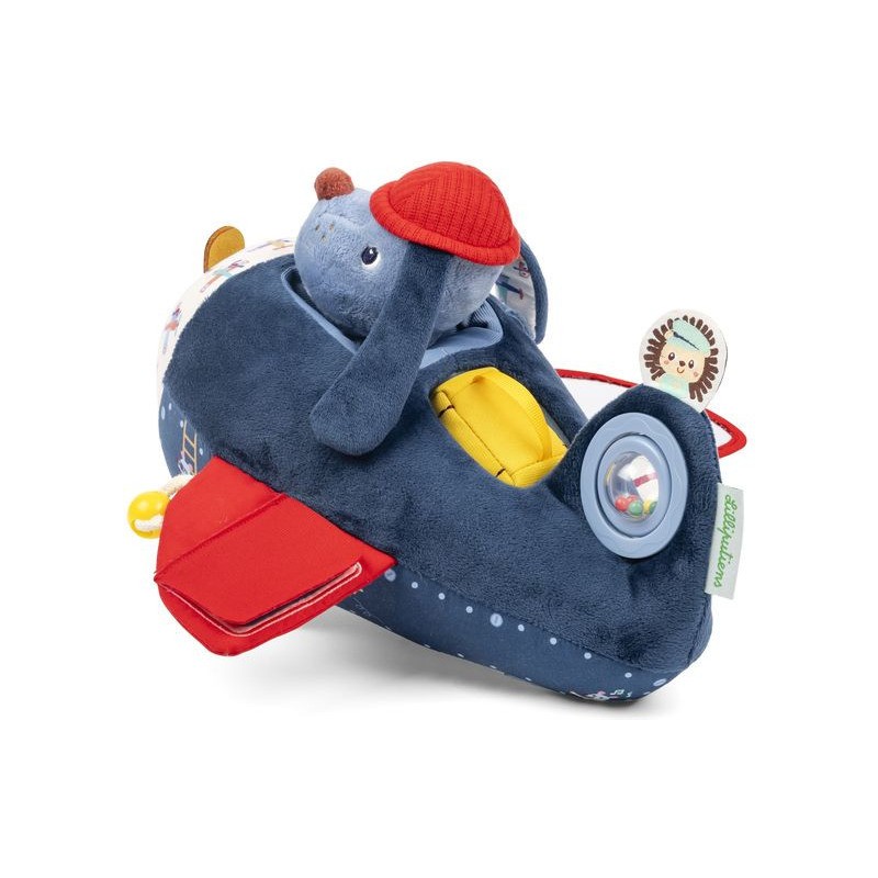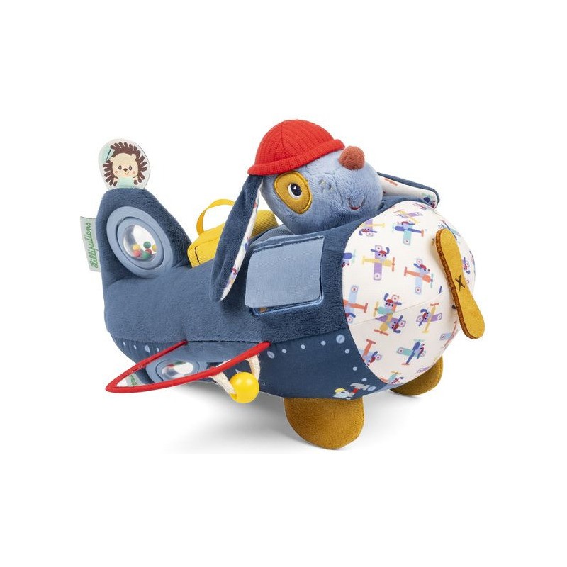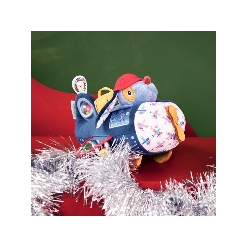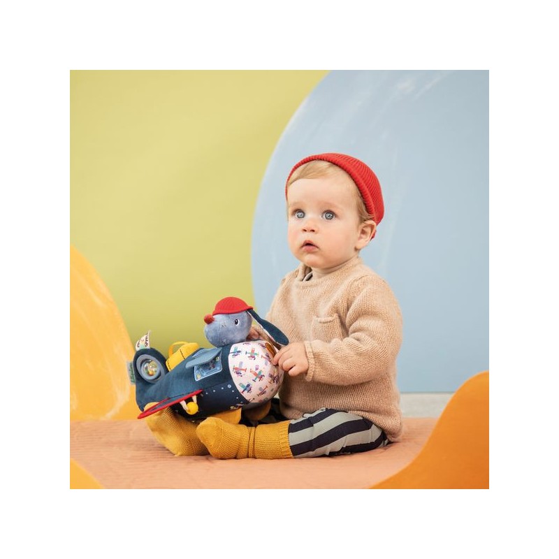 Décollage imminant ! Ce jouet d’activités en forme d’avion et sa petite peluche chien n’ont pas finit de surprendre bébé, à partir de 9 mois. Car quand on est un grand aviateur, et un grand bricoleur, on construit forcément son propre avion ! N’est-ce pas, Jules ? Notre joyeux pilote et son avion en tissu proposent plein d’activités : des volets à soulever, un hochet à billes à faire tournoyer, un petit miroir pour s’observer, un bagage à encastrer encore et encore … Mais aussi des étiquettes amusantes à toucher, et surtout, une petite peluche chien amovible ! Grâce aux différents sons, textures et manipulations, ce jouet d’éveil stimule les sens et la motricité des plus petits. En famille, prenez plaisir à observer toutes les broderies et motifs de cet avion jouet : chaque détail a été pensé pour stimuler l’imagination et attiser la curiosité de bébé. Avec Jules et son avion Lilliputiens, votre bout de chou s’envole pour les tropiques, les plaines enneigées, ou mieux encore : le pays des rêves ! Notre cher Jules a toujours de quoi s’occuper, entre les turbulences qui font chavirer sa valise, la maintenance rigoureuse de l’avion et son copain Léon le hérisson qui joue les passagers clandestins … Cela ne l’empêche pas d’apprécier le voyage, les oreilles au vent, au travers de votre maison ! Encore plus original qu’un cube d’activités, ce jouet premier âge sera d’une grande aide si vous prévoyez votre premier voyage en avion avec votre enfant. Grâce à son côté doux et ludique, il rassure et encourage la curiosité, pour grandir et s’épanouir en bonne compagnie. Dans son format 26 x 26 x 17 cm, ce jouet d’activités en tissu est lavable en surface. Alors, quelle sera votre prochaine destination ?