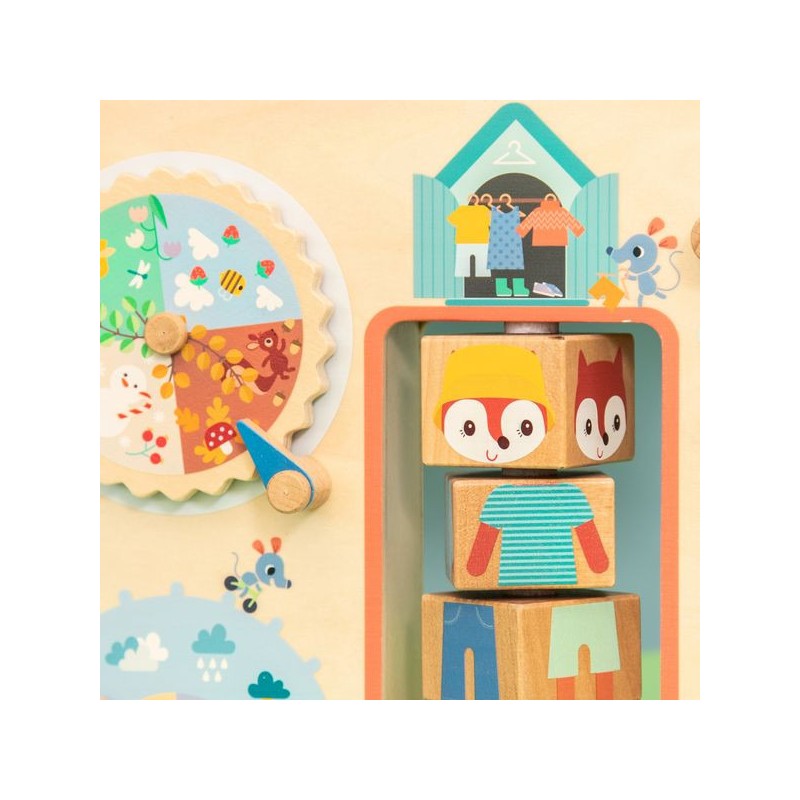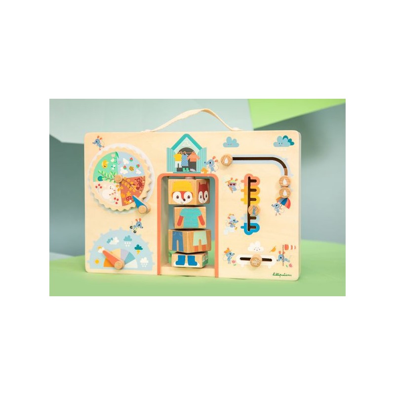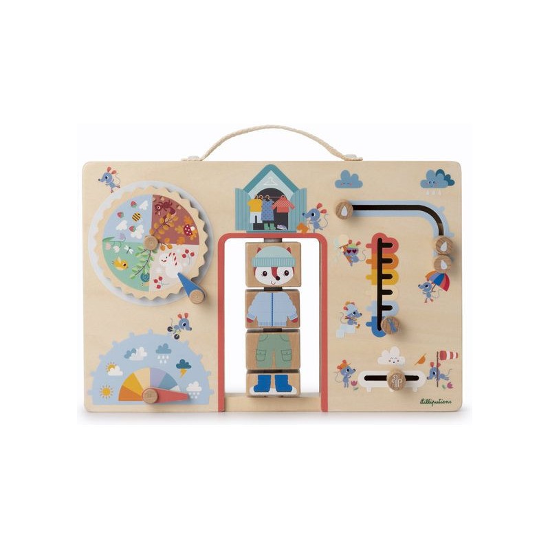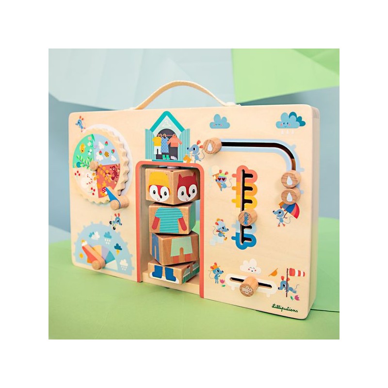 S'habiller selon la météo, ça s'apprend ! Dès l'âge de 2 ans, les enfants profitent d'une jolie valisette en bois pour mieux comprendre les saisons et gagner en autonomie. Dans ce jeu éducatif, retrouvez Alice la renarde et ses copines les souris, prêtes à l'aider à identifier les conditions météo du jour pour choisir la tenue idéale. Grâce aux 6 activités à manipuler présentes sur la mallette, votre enfant découvre par la manipulation tout en développant sa motricité fine. C'est idéal pour rendre l'abstrait plus concret pour les petits, et surtout faciliter les décisions au moment de s'habiller ! Cette valisette en bois est le support où les petits indiquent leurs observations du temps qu'il fait : une véritable routine quotidienne pour votre famille. Votre enfant fait d'abord tourner la mollette des saisons, puis place l'aiguille pour indiquer le temps qu'il fait aujourd'hui, au choix : ensoleillé, partiellement nuageux, couvert, averses de pluie, orages ou averses de neige. S'il pleut, votre enfant peut indiquer l'intensité de la pluie en faisant coulisser 3 petites gouttes sur le parapluie de notre souris bien équipée. Même chose pour le vent : de la simple petite brise aux vents plus forts, il fait glisser une pièce en bois de gauche à droite. Ensuite, très important pour s'habiller en conséquence : la température, bien-sûr ! Du gel hivernal aux chaudes journées d'été, votre enfant place le curseur selon le ressenti ou les prévisions du jour. Il ne reste plus qu'à entrer dans l'armoire d'Alice pour trouver les bons vêtements pour la journée. Grâce aux 4 blocs à faire tourner, habillez notre renarde de la tête aux pieds. Et voilà, votre bambin n'a plus qu’à faire de même ! Le petit plus de ce jeu éducatif Lilliputiens, c'est la poignée en tissu très pratique pour que votre enfant manipule la valisette à sa guise. Format 31x20 cm, lavable en surface uniquement.