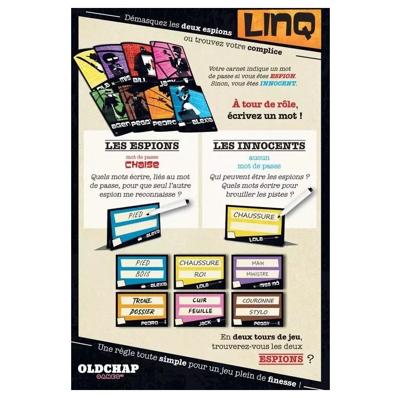 Des mots bidons pour démasquer les espions ! Deux espions ont connaissance d'un mot en commun et doivent s'identifier mais les autres joueurs vont tenter de les démasquer. Chaque joueur va écrire deux mots : Arbre, Chocolat, Papier, Enveloppe... À vous de trouver le lien qui fait la paire !