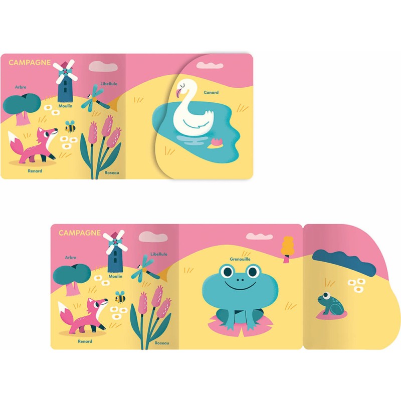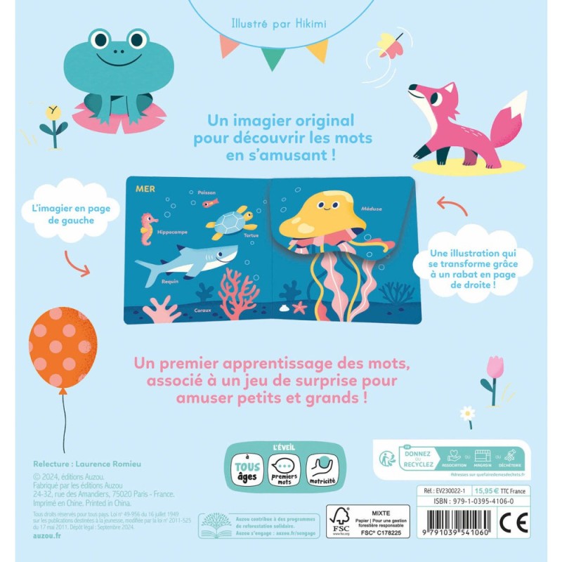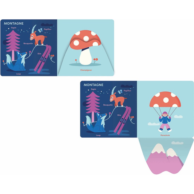 Mon premier imagier à flaps ! Un premier imagier à flaps pour apprendre en s'amusant : un imagier thématique en page de gauche et, en page de droite, une illustration d'un mot de cette thématique qui se transforme en une autre illustration (accompagné d'un autre mot, de la même thématique) grâce à des rabats.