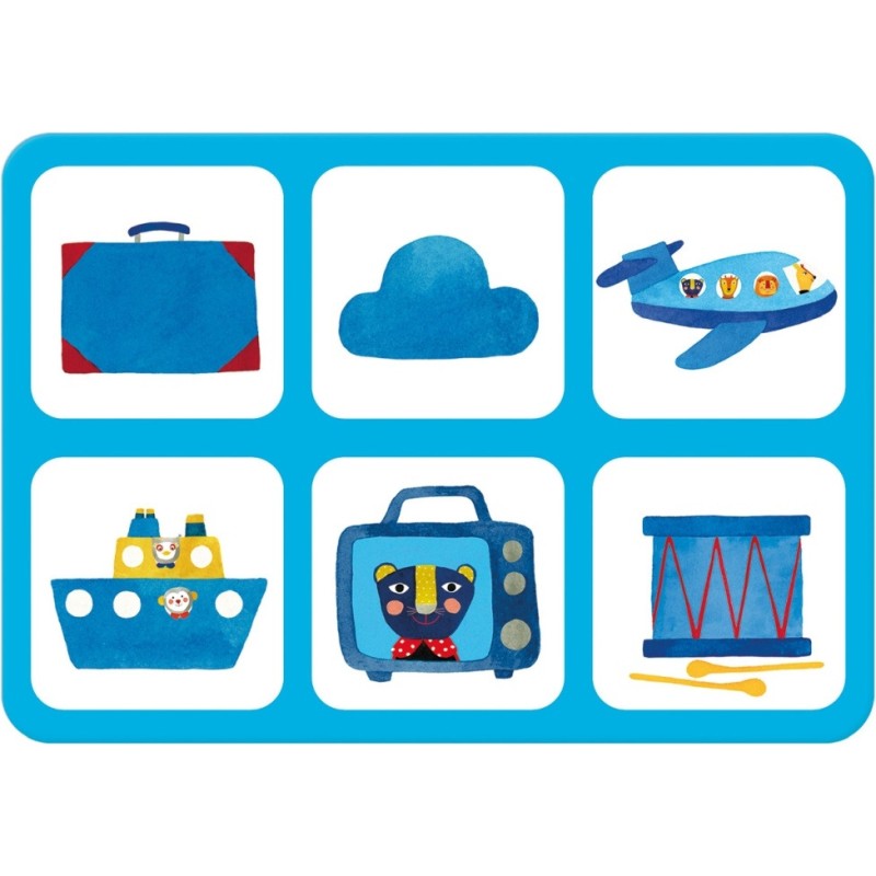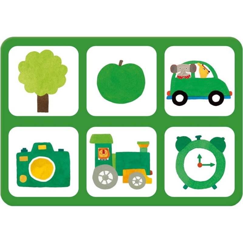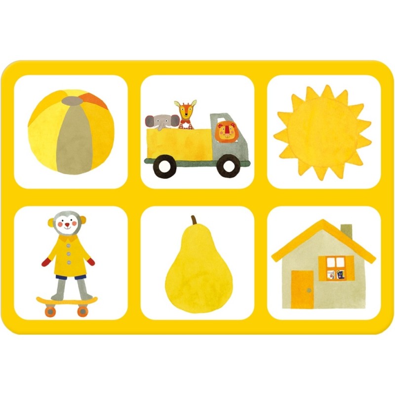 Jeu d'éveil en carton regroupant quatre planches de couleurs primaires, aux illustrations d'objets du quotidien, traité comme un imagier, reprenant l'association graphique de la gamme.« Un loto pour observer, apprendre et nommer les couleurs et les objets ».