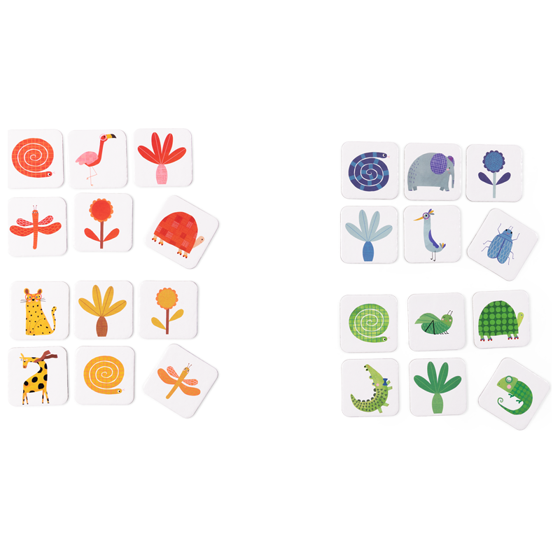 Loto Les Toupitis traité comme un imagier, comprend 4 planches de couleurs illustrées des animaux et végétaux de la collection pour observer et associer des images. Le 1er à avoir complété entièrement sa ou ses planches remporte la partie. Dès 2 ans.