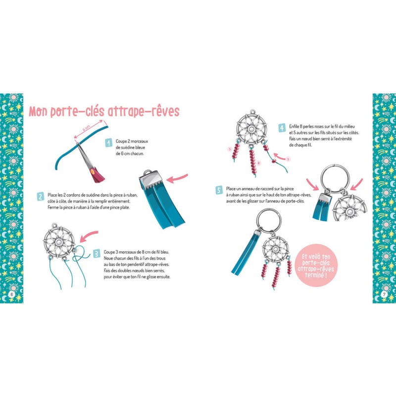 Réalise 6 bijoux et grigris attrape-rêves grâce à tout ton matériel : 6 pendentifs attrape-rêves Du ruban Liberty Du fil Des perles Des fermoirs Un porte-clef
