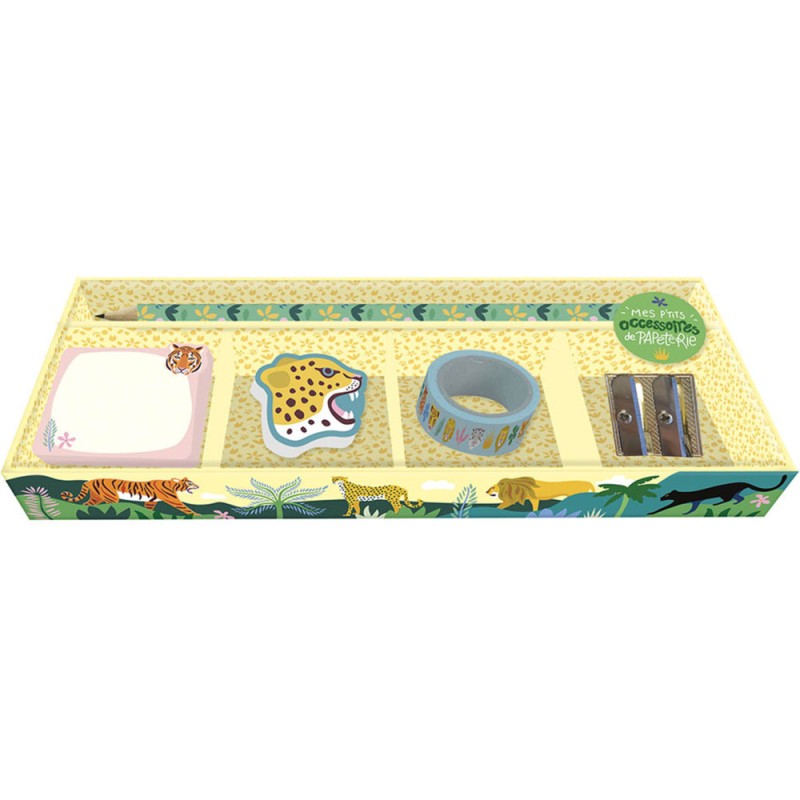 Un petit coffret avec plein d’accessoires pour le bureau, aux couleurs de la gamme: un crayon, une gomme, un taille-crayon, des petites notes repositionnables et un joli masking-tape. Le joli coffret peut être utilisé comme rangement de bureau également.