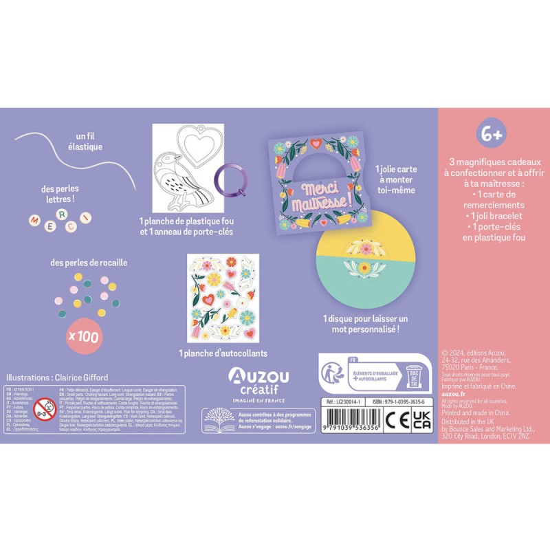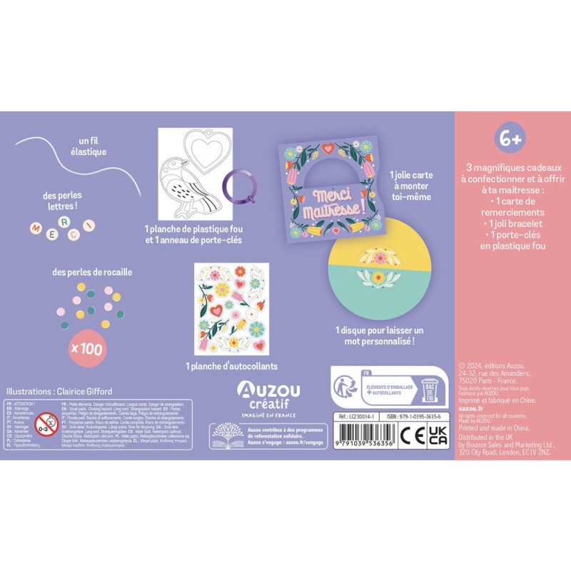 3 magnifiques cadeaux à confectionner et à offrir à ta maitresse pour la remercier de cette année passée à ses côtés : une carte personnalisée à monter et à rédiger ; un bracelet perles-lettres « merci », et un porte-clef en plastique fou à customiser. La pochette propose aussi une enveloppe/pochette cadeau pour offrir le tout !