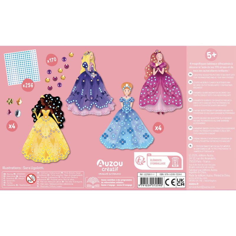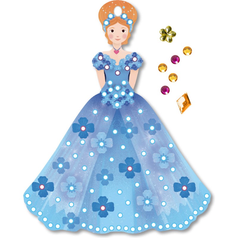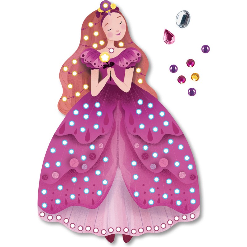 Une pochette qui propose 4 jolies robes de princesses à décorer avec des strass multicolores