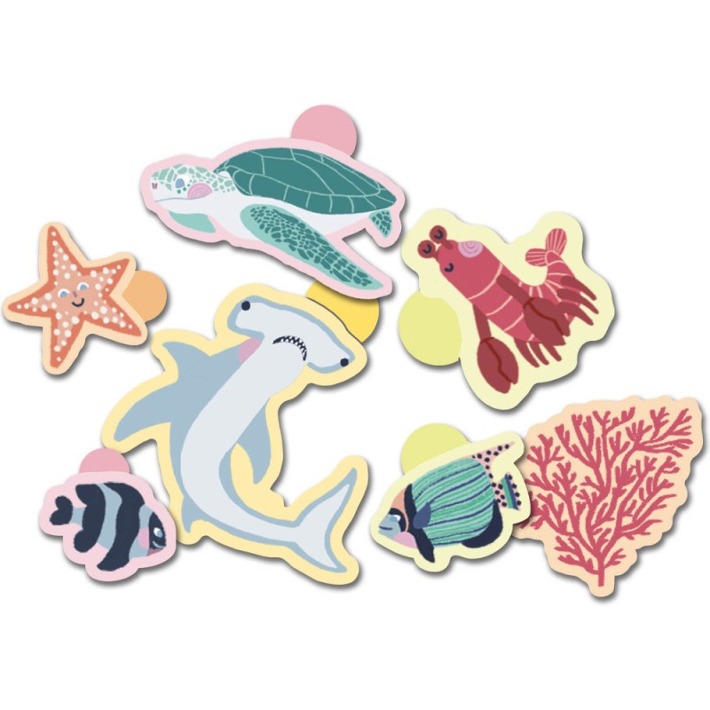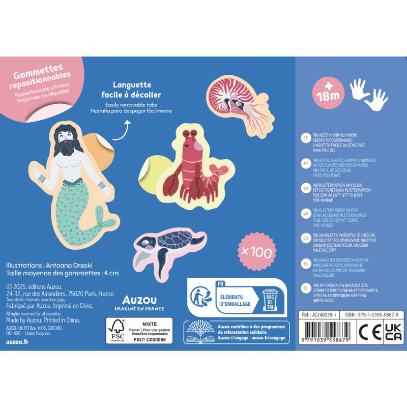 100 gommettes animaux de la mer repositionnables pour favoriser la créativité des enfants. Avec la grosse languette facile à décoller, les autocollants peuvent être utilisés en toute autonomie dès l’âge de 18 mois.