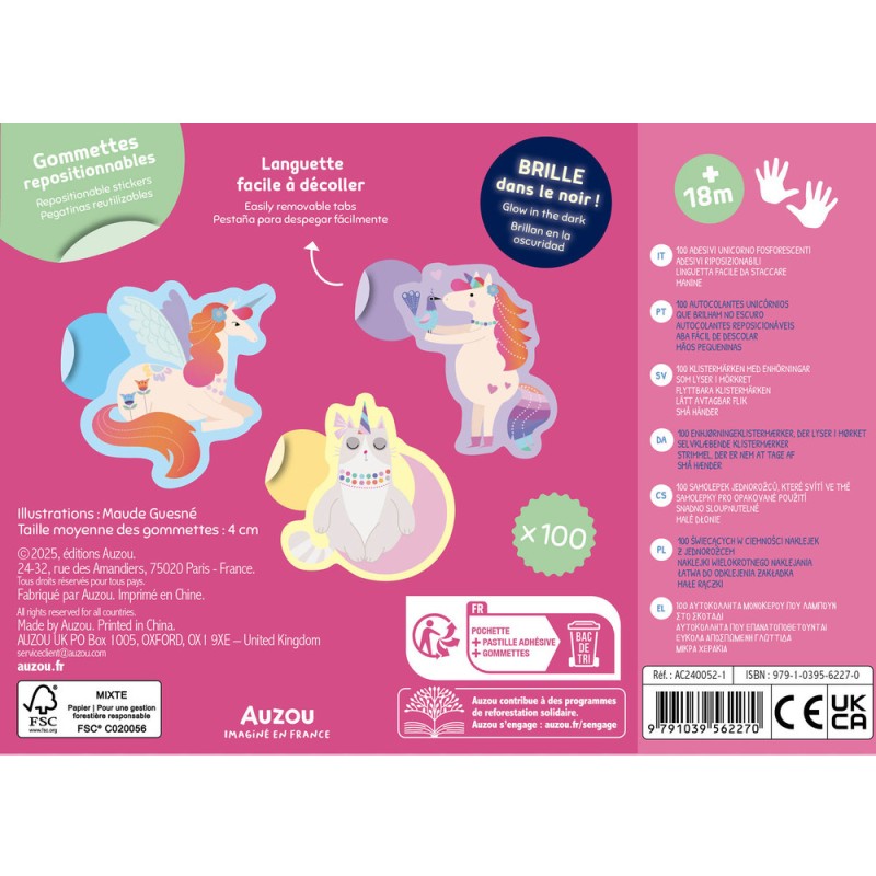 Une pochette de gommettes repositionnables sur le thème féérique des licornes ! Et bonus : elles brillent dans le noir ! Les gommettes sont faciles à détacher grâce à la languette dont elles disposent.