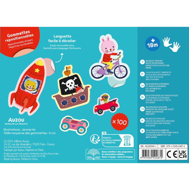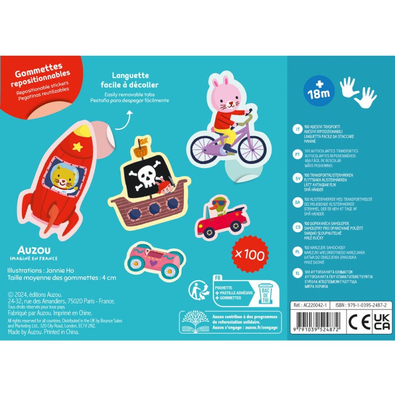100 gommettes des transports, repositionnables pour favoriser la créativité des enfants. Avec la grosse languette facile à décoller, les autocollants peuvent être utilisés en toute autonomie dès l’âge de 18 mois.