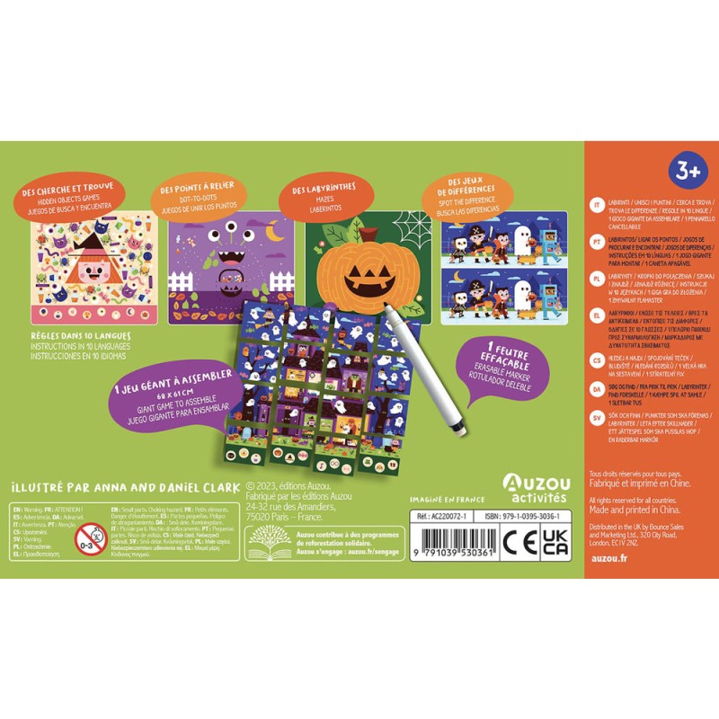 Une pochette de jeux sur le thème des monstres et sorcières à partir de 3 ans ! Au recto des cartes, amuse-toi avec des labyrinthes, des points à relier, des cherche et trouve, des différences… Rassemble ensuite les cartes côté verso pour reconstituer un cherche et trouve géant ! 20 jeux plastifiés à faire et à refaire ! Inclus : 1 feutre effaçable et 2 cartes solutions.